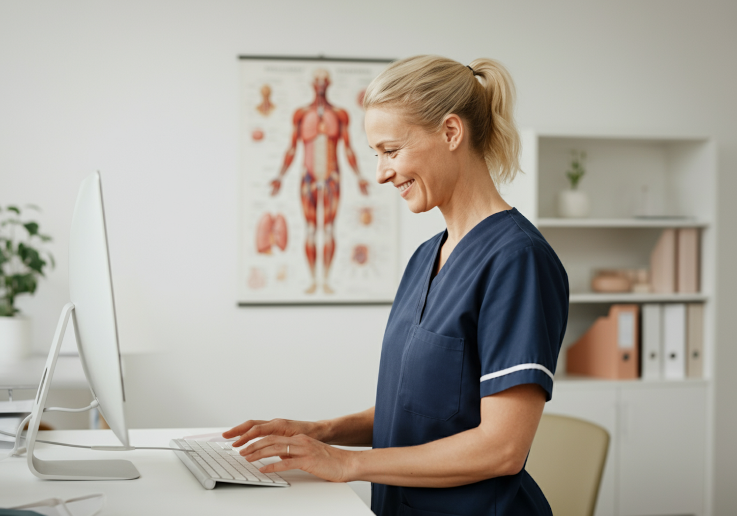 A smiling healthcare professional in a navy uniform works at a computer in a bright, organized office with anatomy charts and shelves.