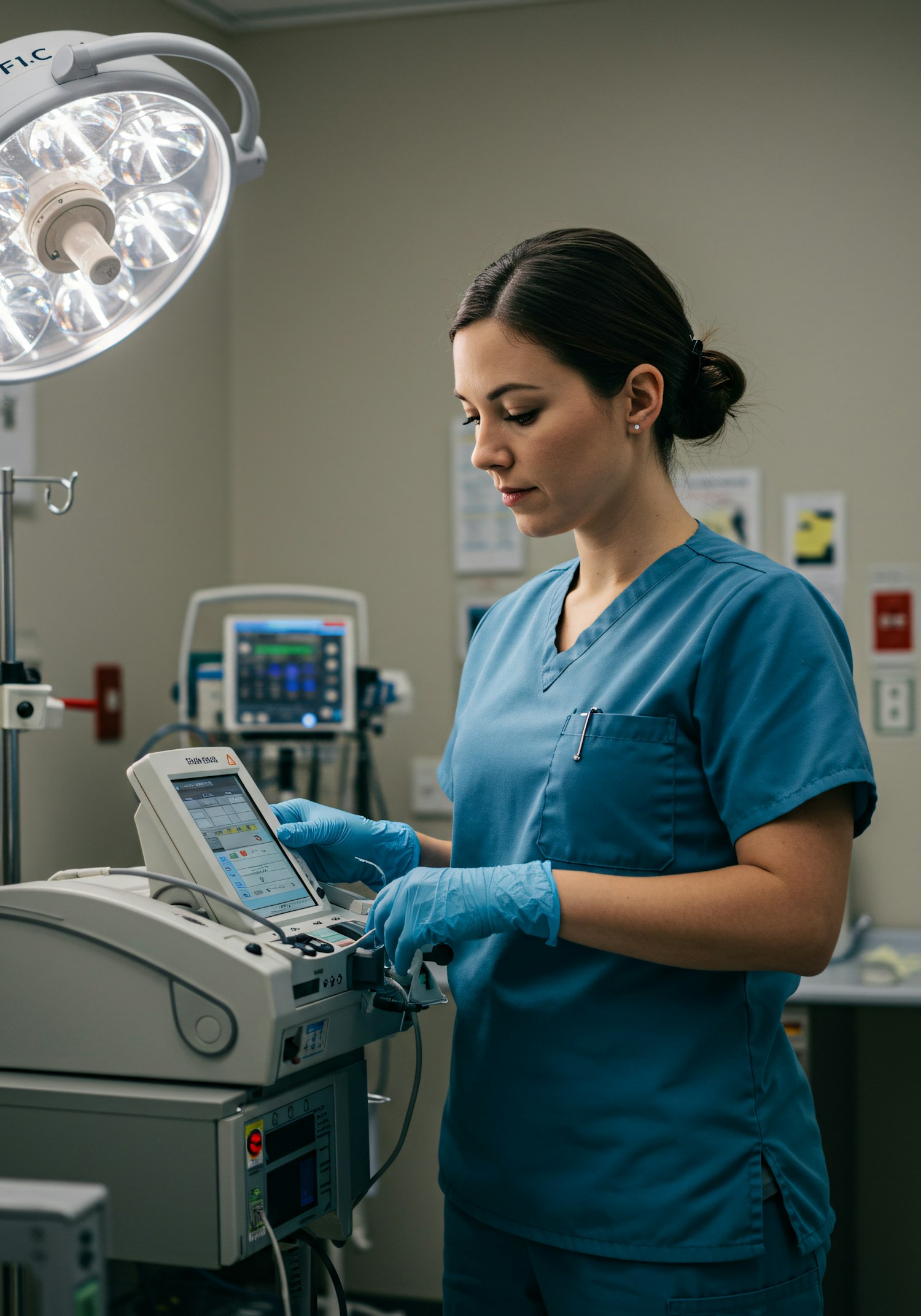 A healthcare worker in blue scrubs operates medical equipment in a clinical setting, showcasing a professional medical environment.