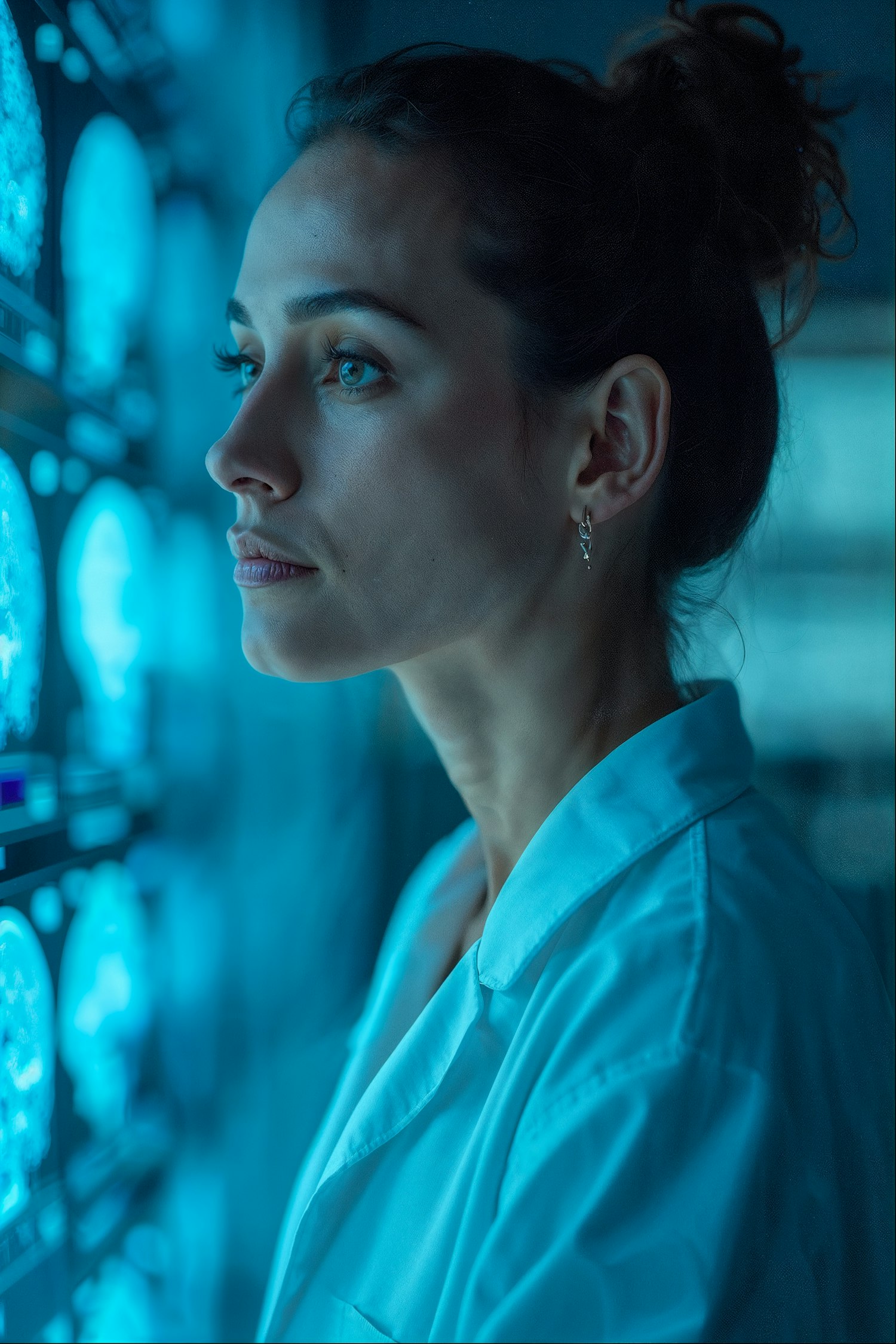 Woman in lab coat examines brain scans on a screen, illuminated by blue light, in a medical setting.