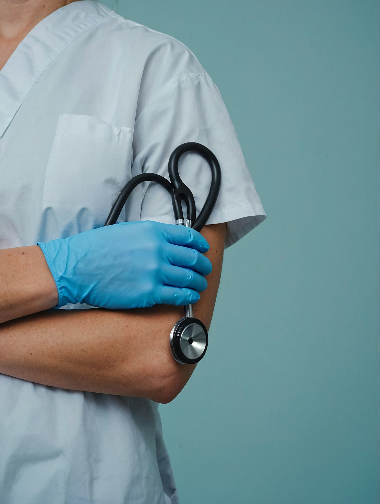 Close-up of a healthcare worker in white scrubs and blue gloves holding a stethoscope, set against a teal background.