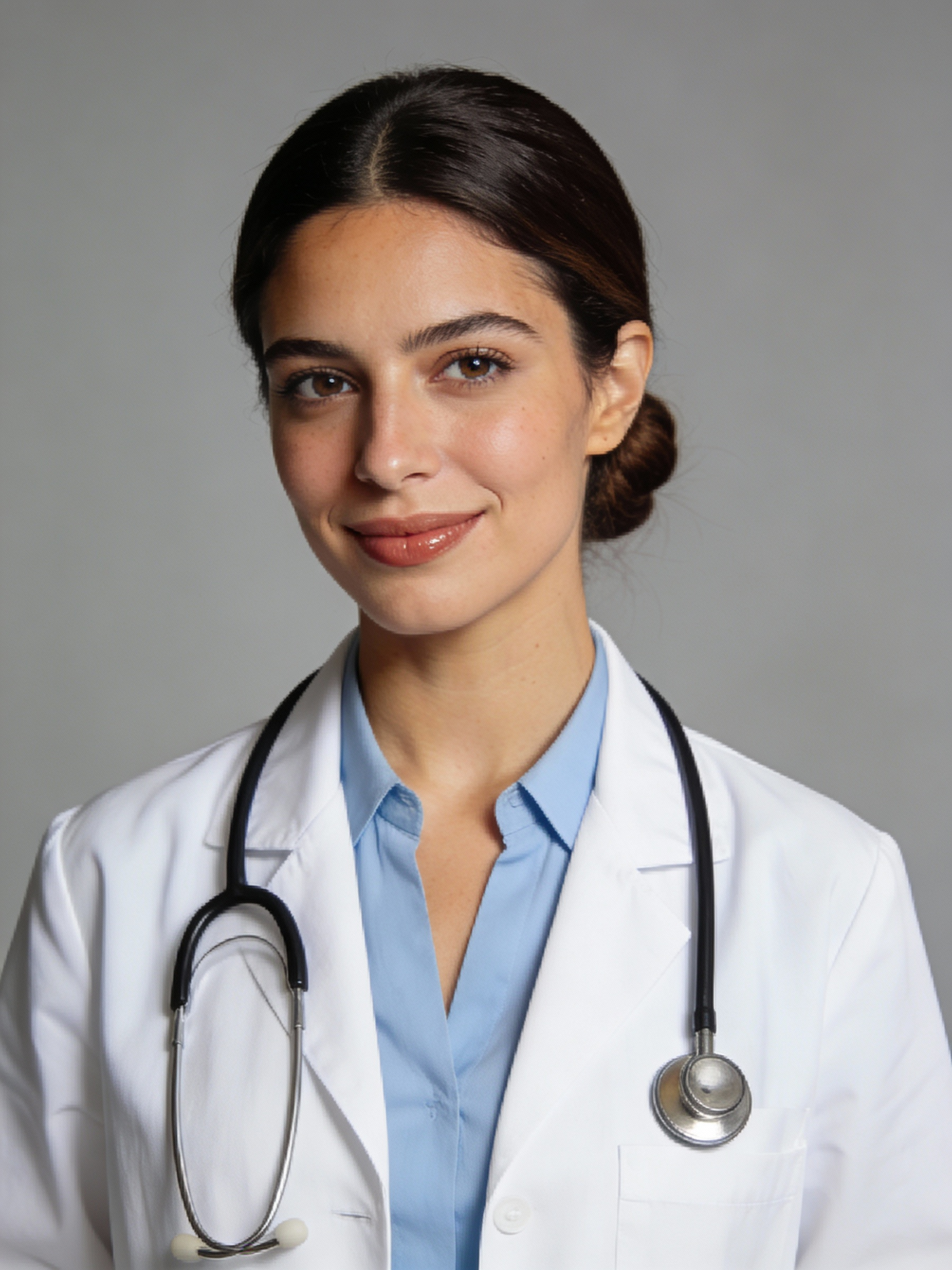 A professional in a white lab coat with a stethoscope, exuding confidence and expertise in a neutral background.