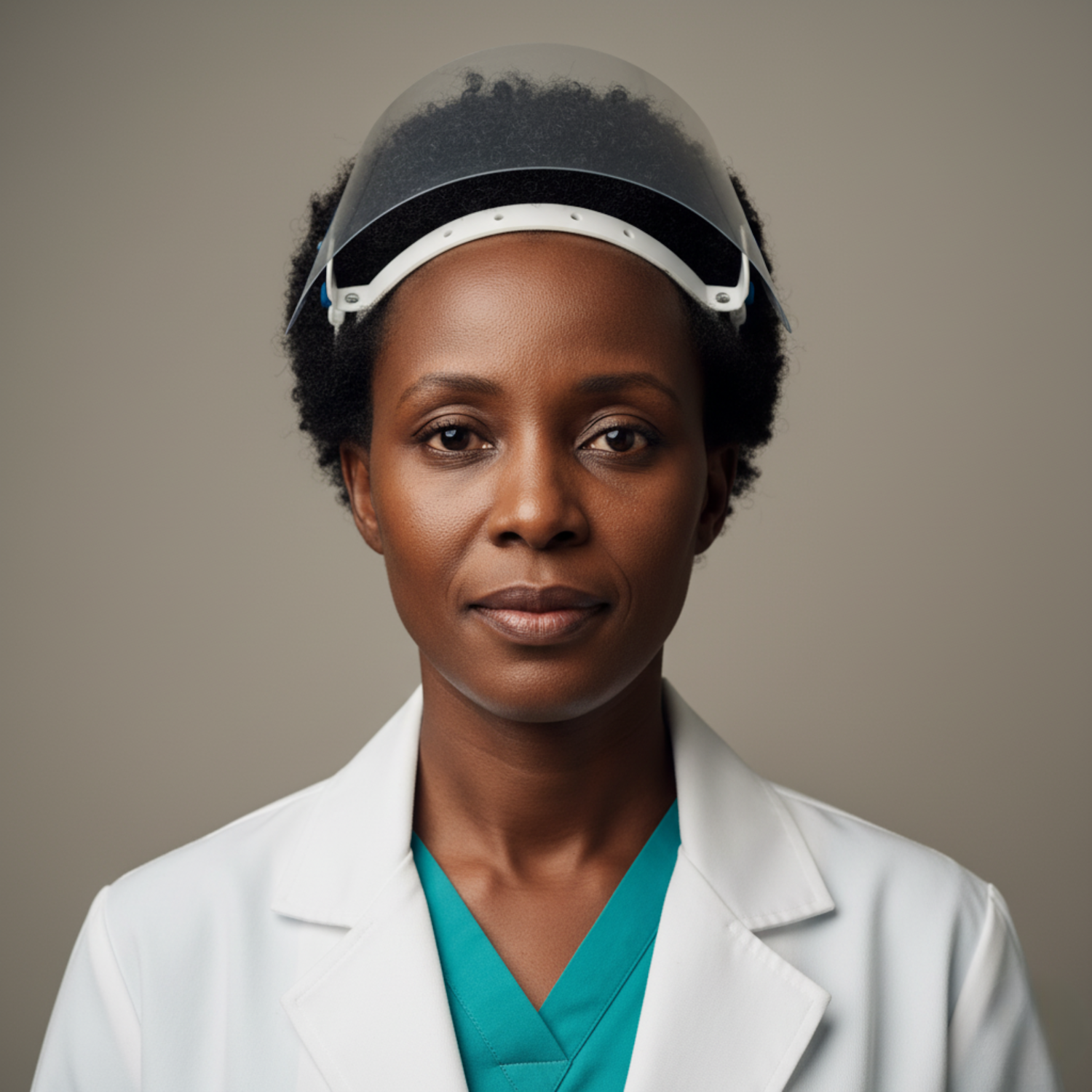 A professional in a white lab coat and teal scrubs, wearing a face shield, exudes focus and dedication in a neutral setting.