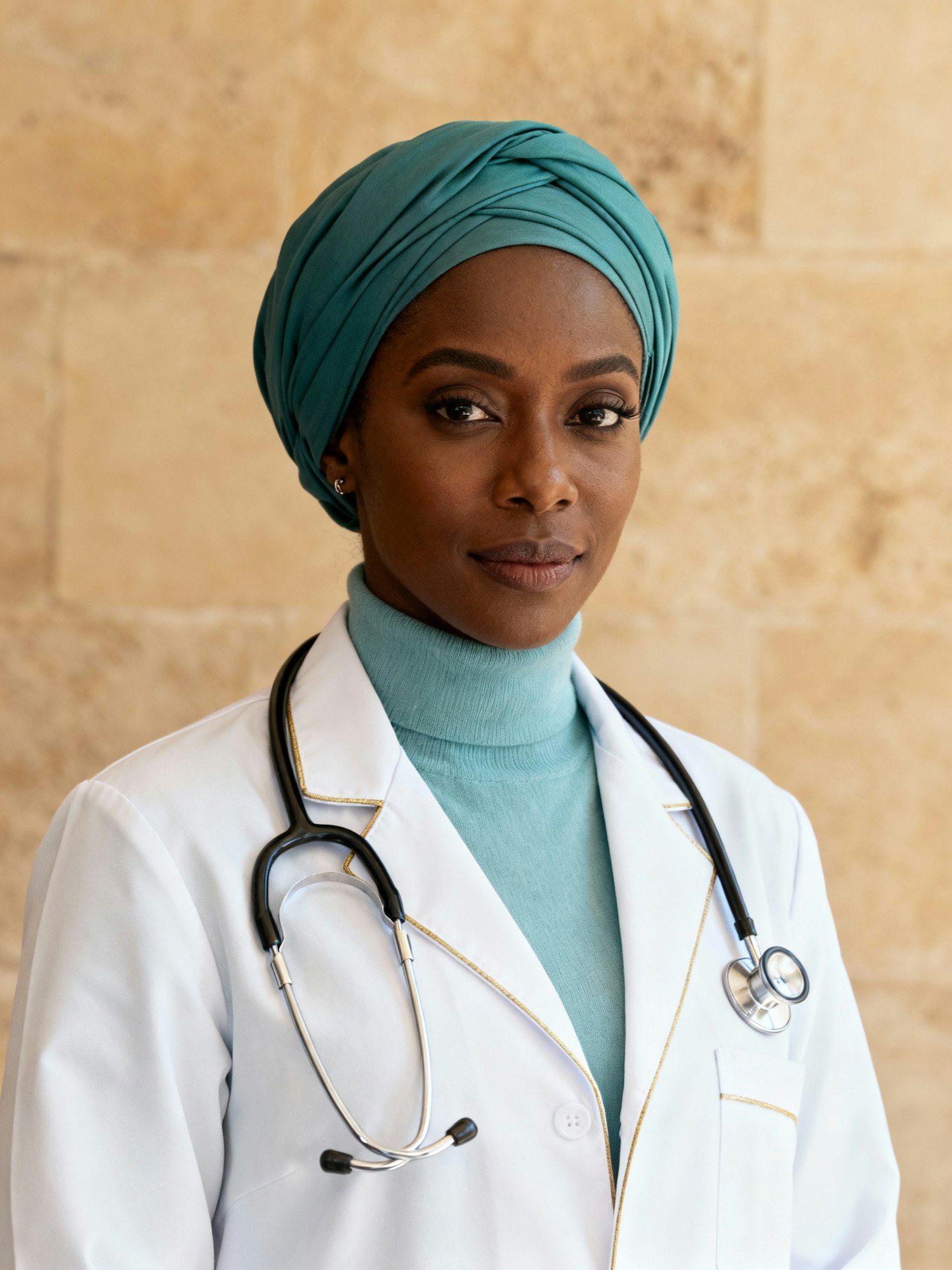 A professional in a white lab coat and teal headscarf, with a stethoscope, standing against a neutral background.