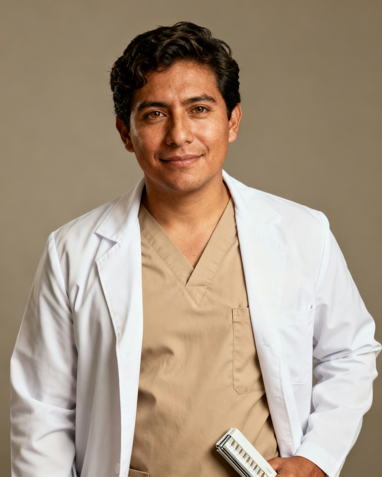 Studio portrait of an Aymara male dentist in his thirties; warm tan skin; short dark waves; hazel-brown eyes; white coat, sand scrub top, sterile shade guide closed, held at hip (generic); framing: include entire head with a little headroom; neutral seamless backdrop; Rembrandt lighting; 105mm macro-sharp; photorealistic, editorial. Expression: calm, friendly. Negative: youthifying skin blur, brand logos, cropped crown.