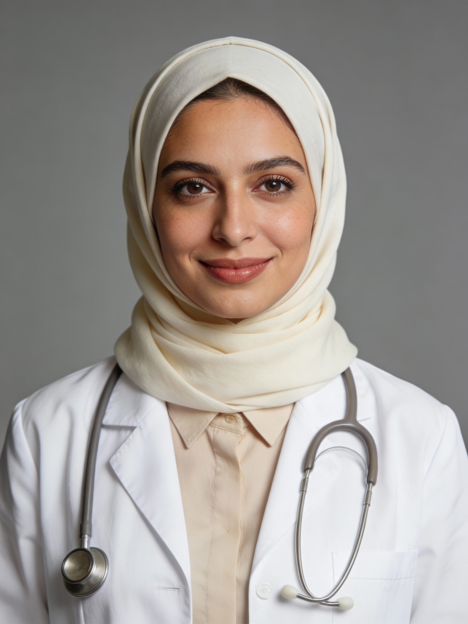 Studio portrait of a Syrian female general practitioner, age 36; light olive skin, warm undertone; soft cream hijab wrapped neatly; white lab coat over a light beige blouse, no logos; a stethoscope draped softly around her neck; neutral mid-gray seamless backdrop; Rembrandt lighting with soft fill; 105 mm macro-sharp. Expression: composed and caring, gentle closed-mouth smile. Framing: portrait orientation, 3:4 ratio; mid-chest-up composition. Subject centered in frame, camera at eye level, facing directly toward the camera (front view). Full hijab and head completely inside the frame with a little space above; both shoulders visible, no cropping at the top or sides. Neutral studio composition, no props.