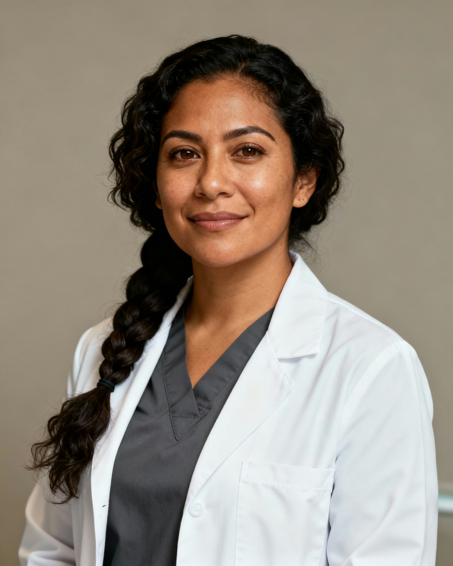 Studio portrait of a Māori woman dentist in her thirties; medium-tan skin, warm undertone; thick dark wavy hair in a low braid; deep-set brown eyes; white coat over charcoal scrubs; framing: entire head visible with slight headroom—no crown crop; neutral seamless backdrop; Rembrandt lighting; 105mm macro-sharp detail; photorealistic, editorial. Expression: calm, grounded warmth. Negative: youthifying blur, brand logos, head crop.