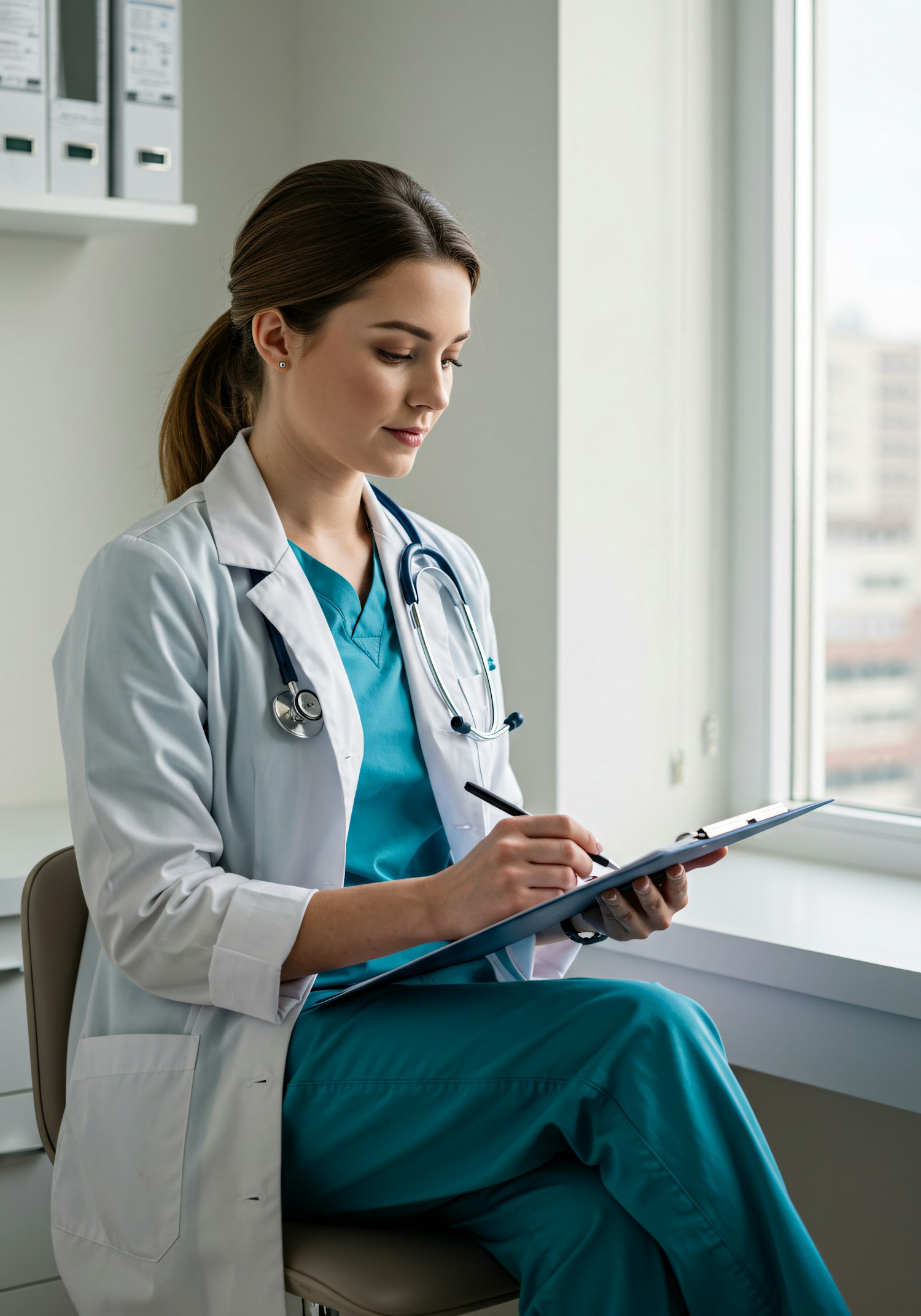 A focused medical professional in a white coat and scrubs writes on a clipboard in a bright, modern office setting.