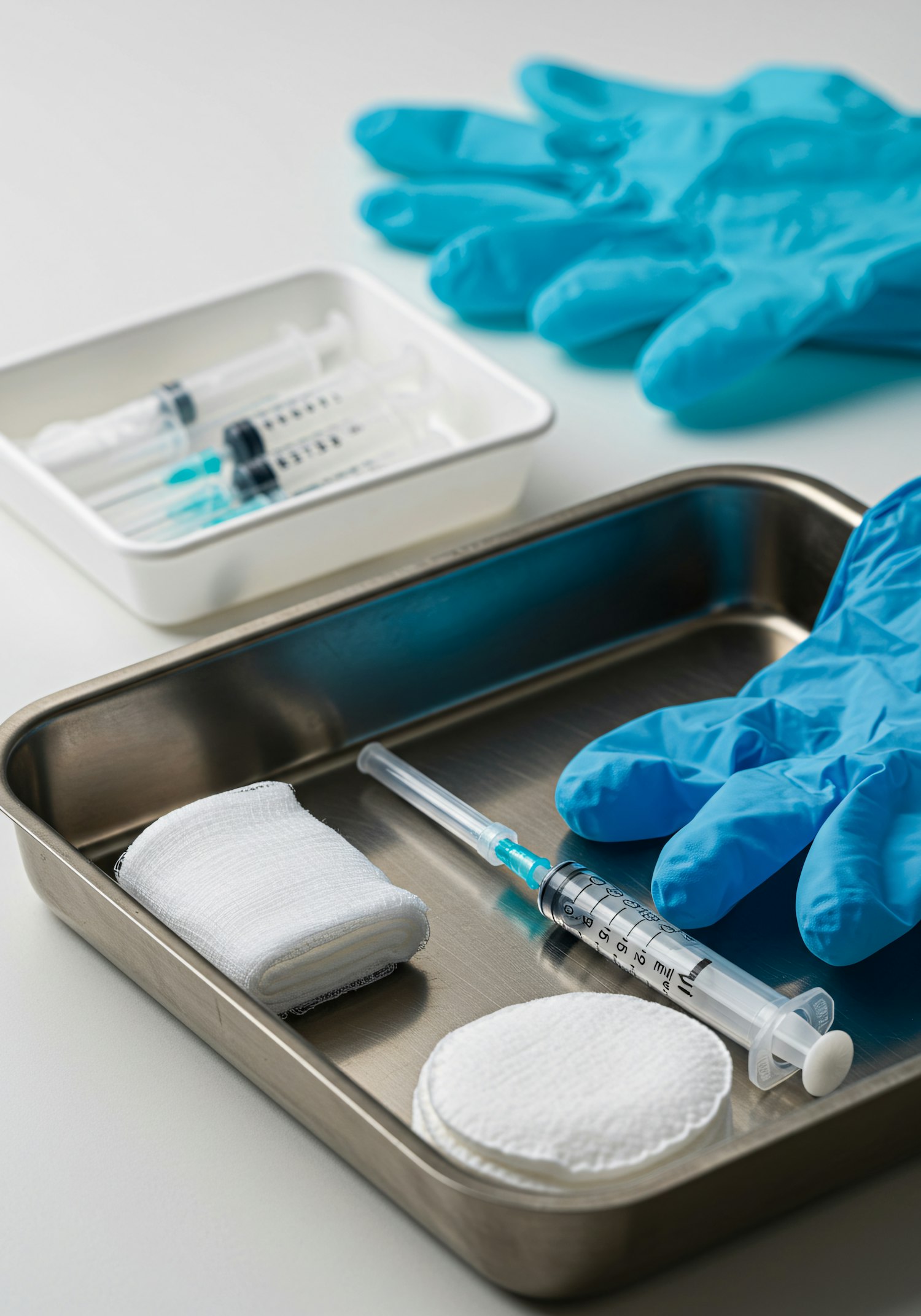 Sterile medical setup with syringes, gauze, and gloves on a stainless steel tray, ready for a procedure in a clean environment.