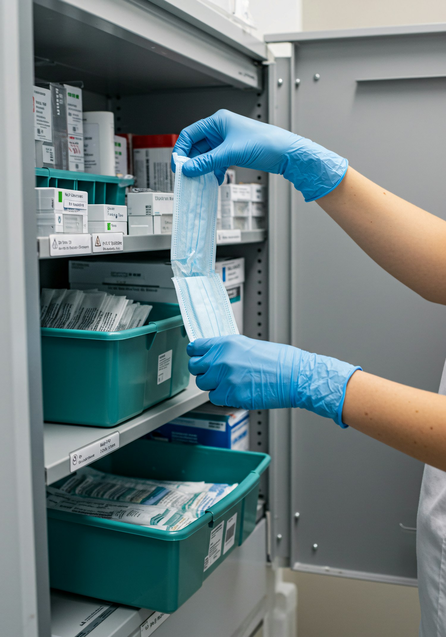 Gloved hands handling a surgical mask in a well-organized medical supply storage area, emphasizing hygiene and professionalism.