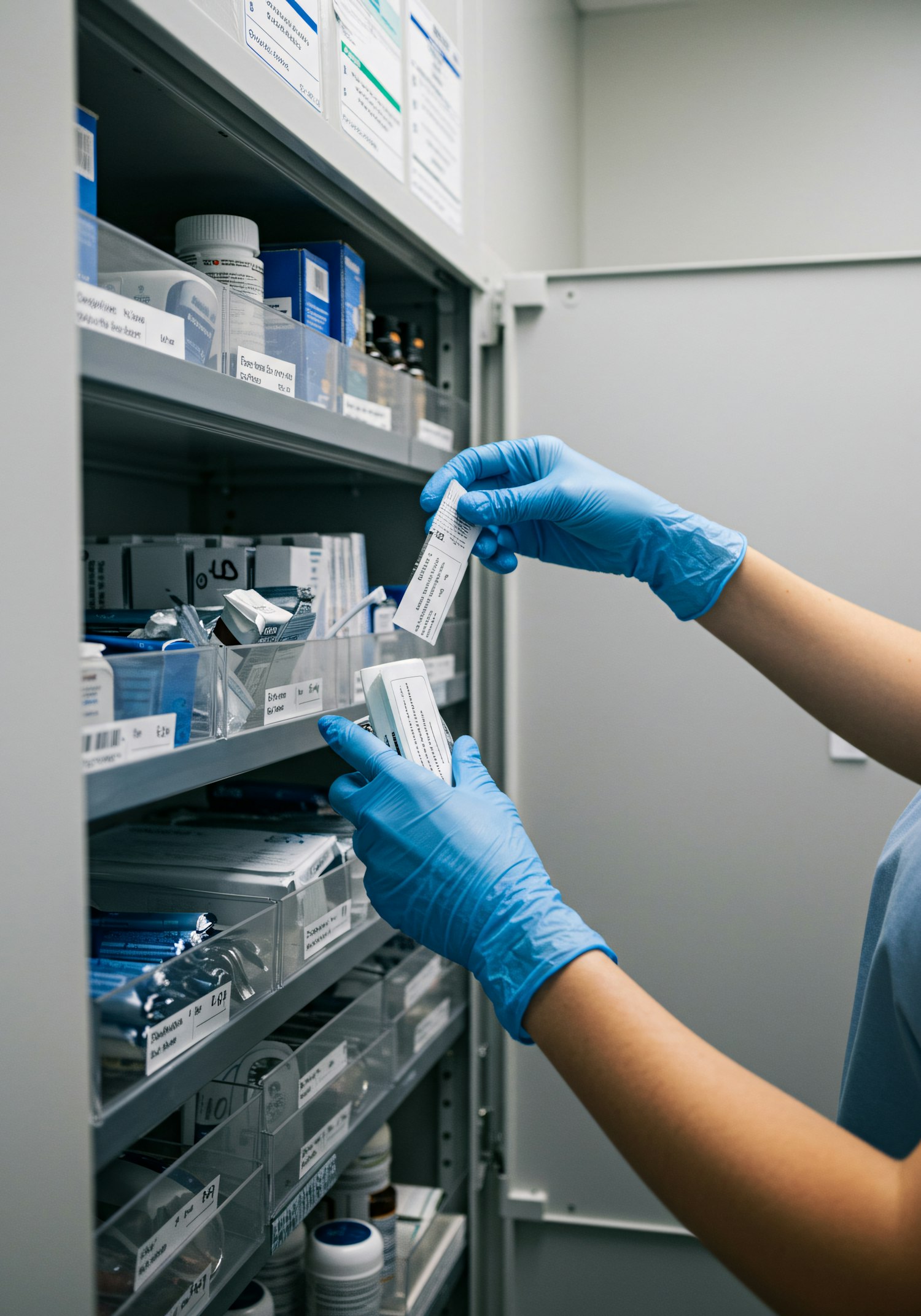 Gloved hands organizing medical supplies in a well-stocked cabinet, showcasing a clean and professional healthcare setting.