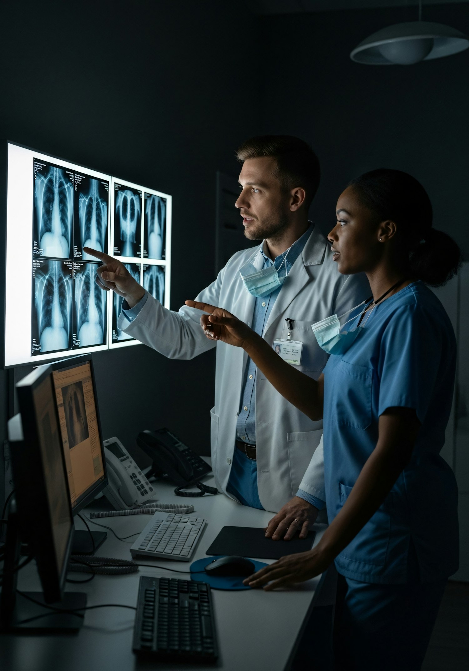 A doctor and nurse analyze X-rays in a clinical setting, showcasing teamwork and focus in a medical environment.