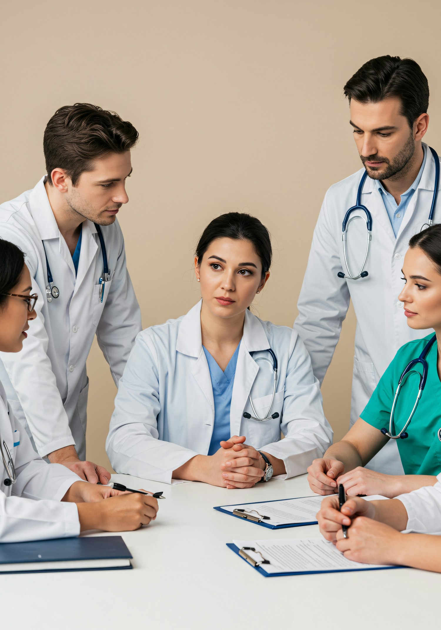 A team of doctors in lab coats and scrubs collaborate around a table, discussing and taking notes in a professional setting.