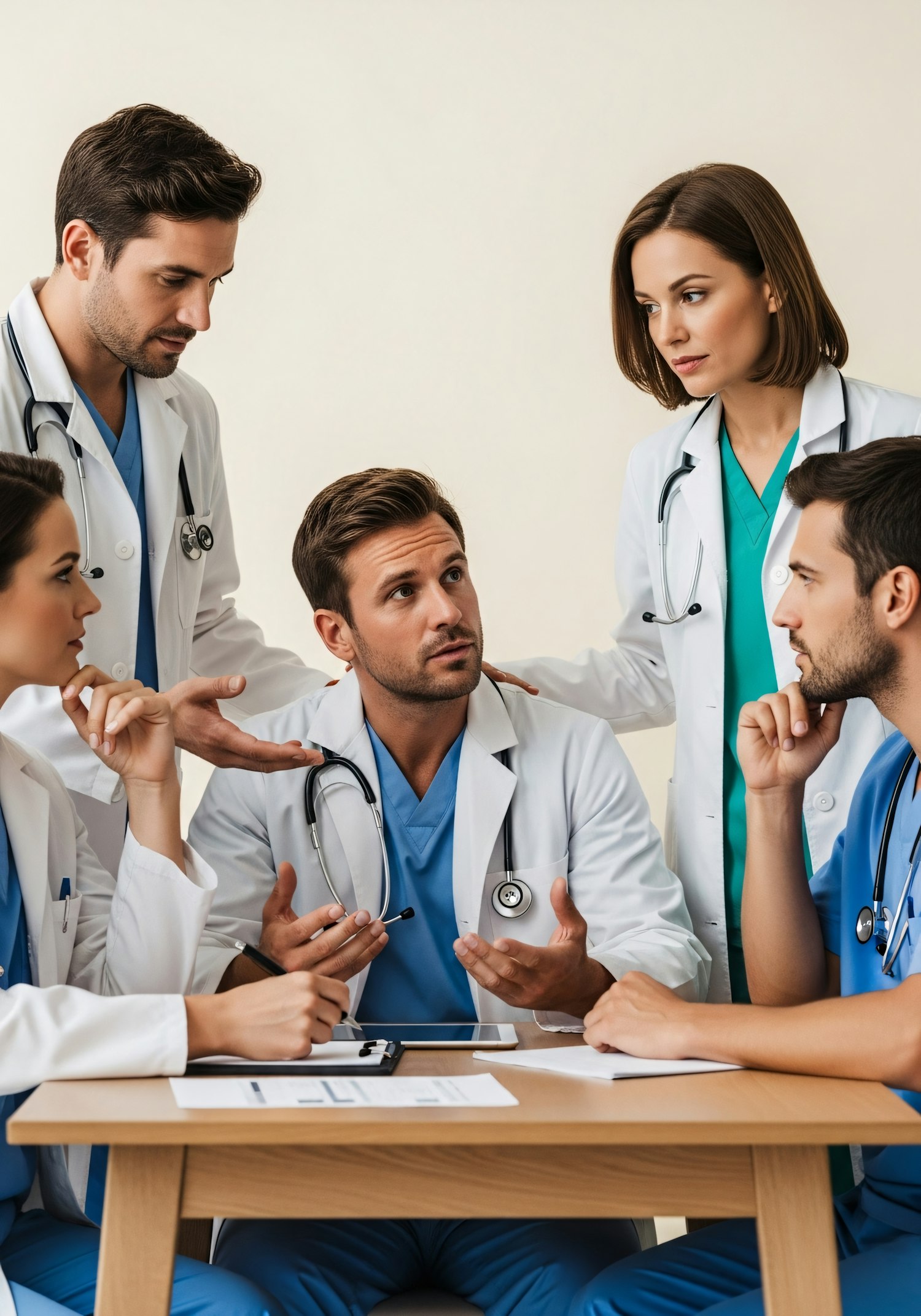 A team of doctors in lab coats and scrubs collaborates in a professional setting, discussing and sharing ideas around a table.