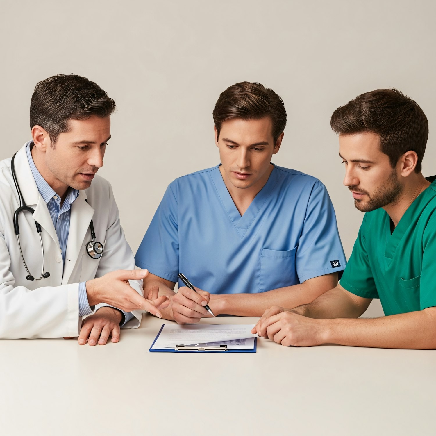 Three medical professionals discussing a document, with one in a white coat and two in scrubs, collaborating in a neutral setting.