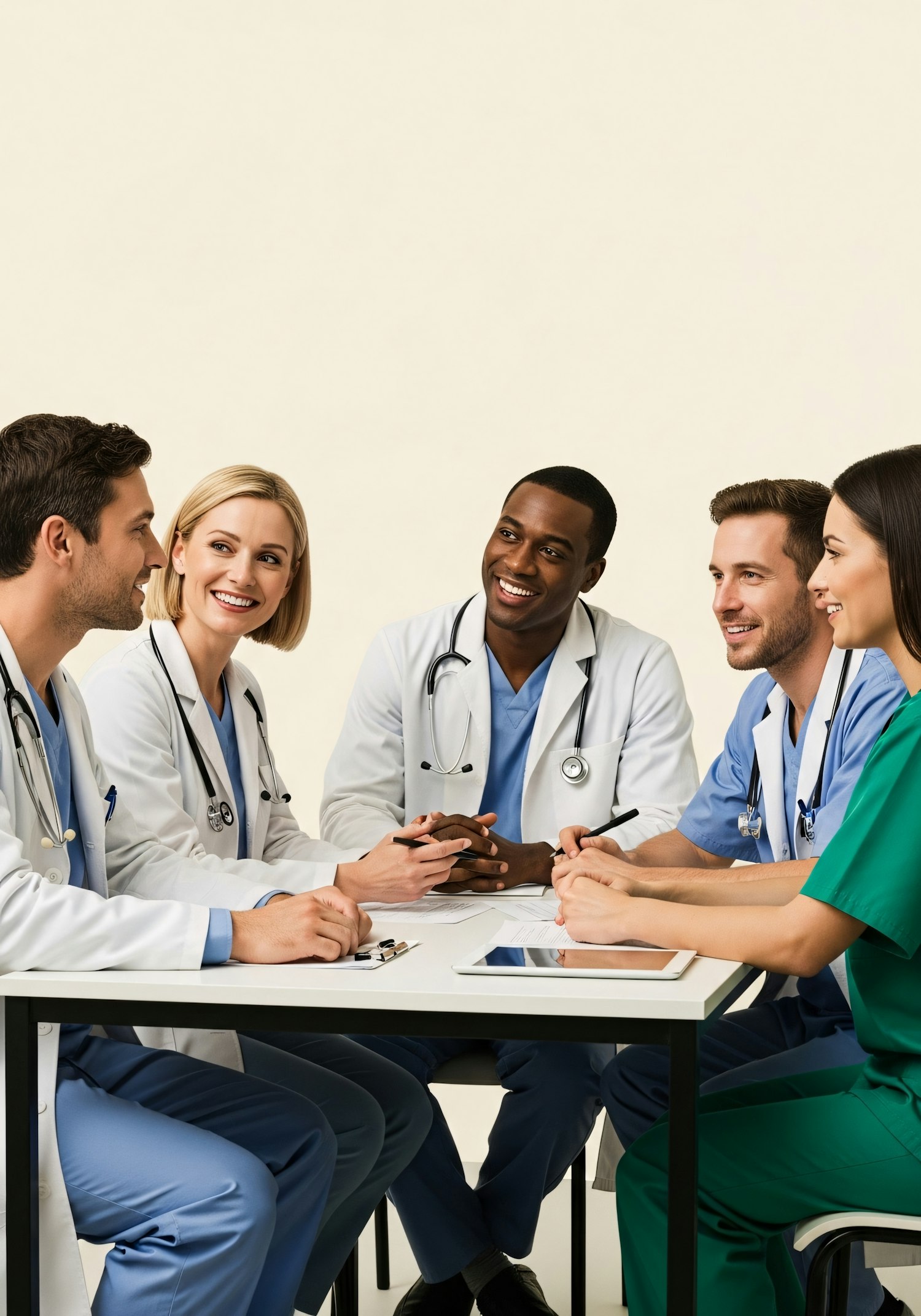 A diverse group of medical professionals in discussion, wearing scrubs and white coats, seated around a table with documents and a tablet.