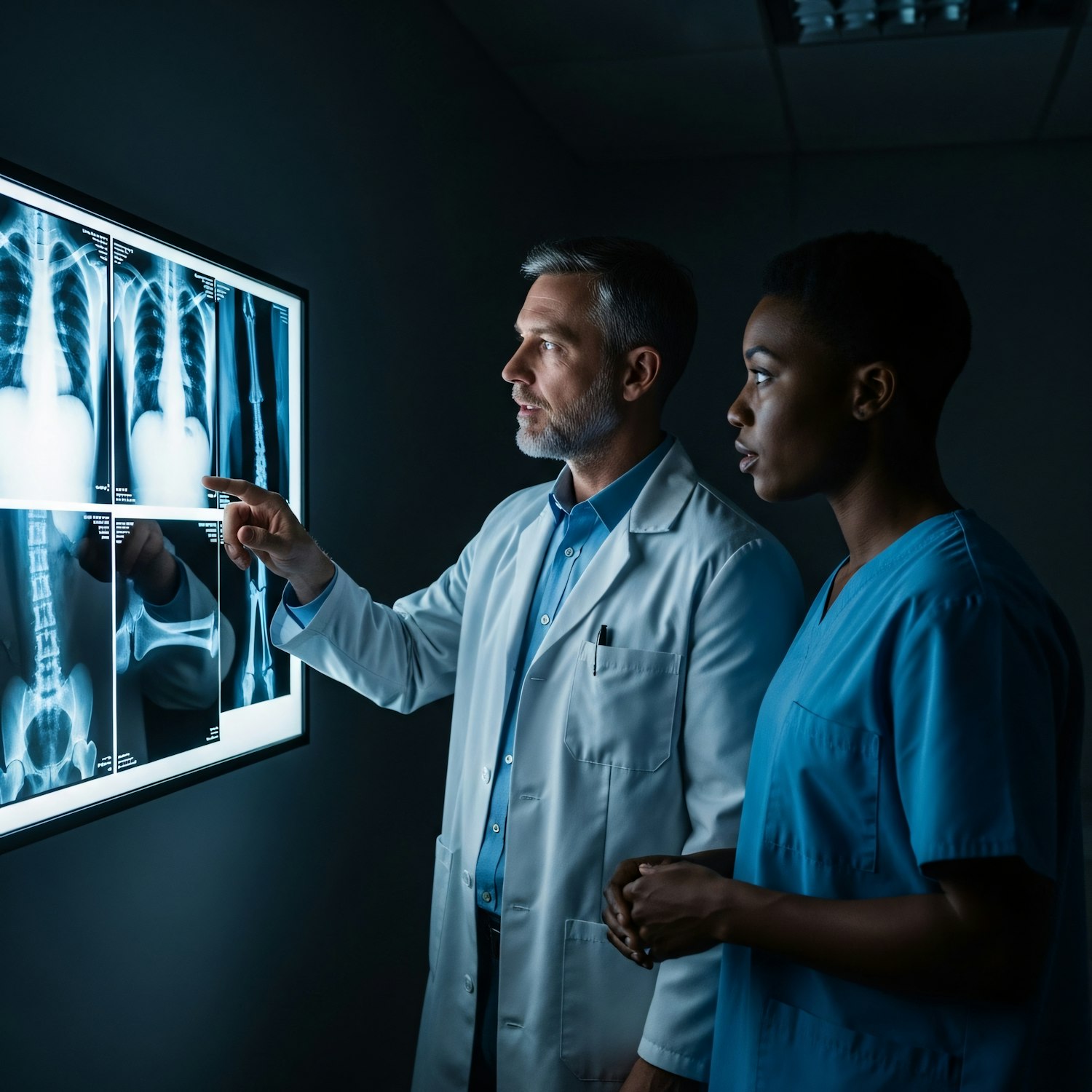 A doctor and a nurse examine X-rays together in a dimly lit room, focusing on the illuminated display for a medical discussion.