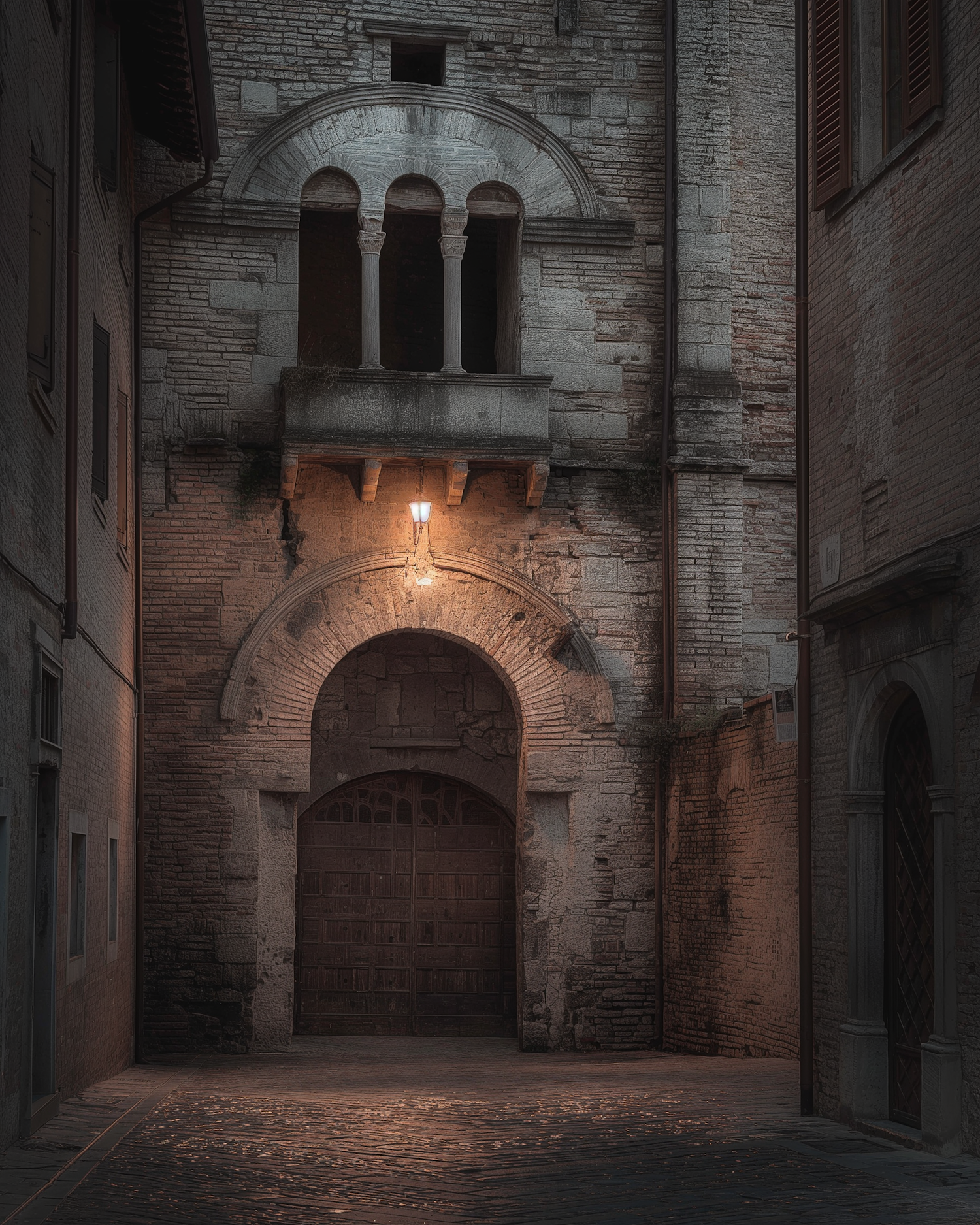 Dimly lit medieval alley with stone archway and wooden door, illuminated by a warm light, creating a mysterious and historical ambiance.
