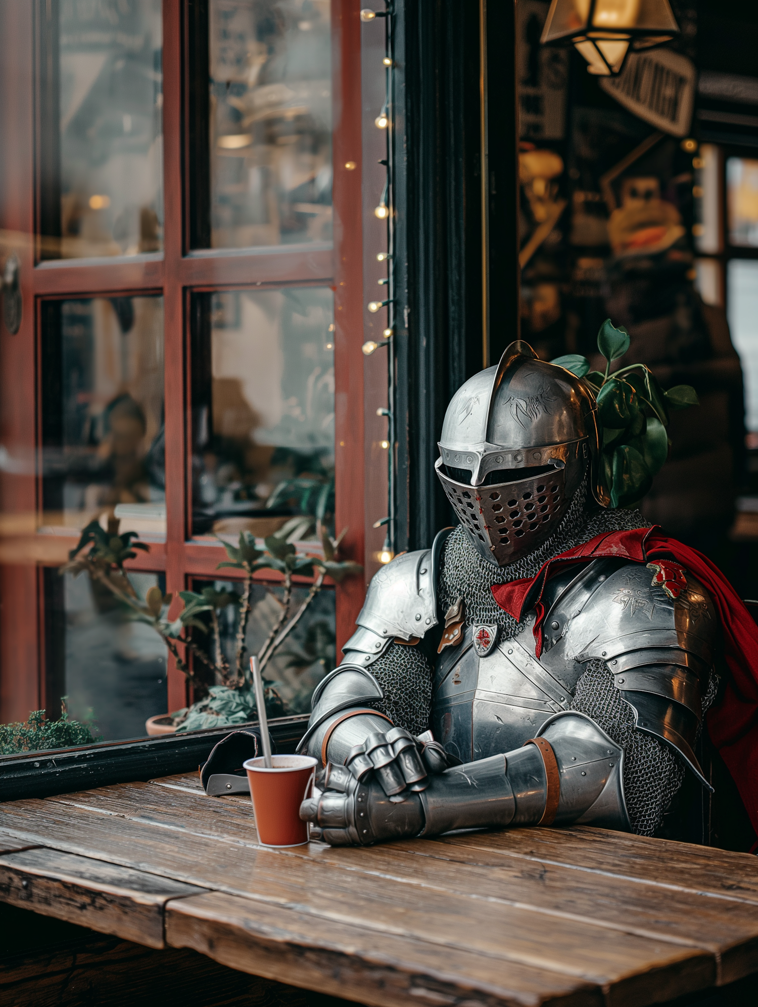 A knight in full armor enjoys a drink at a cozy cafe, blending medieval and modern vibes.