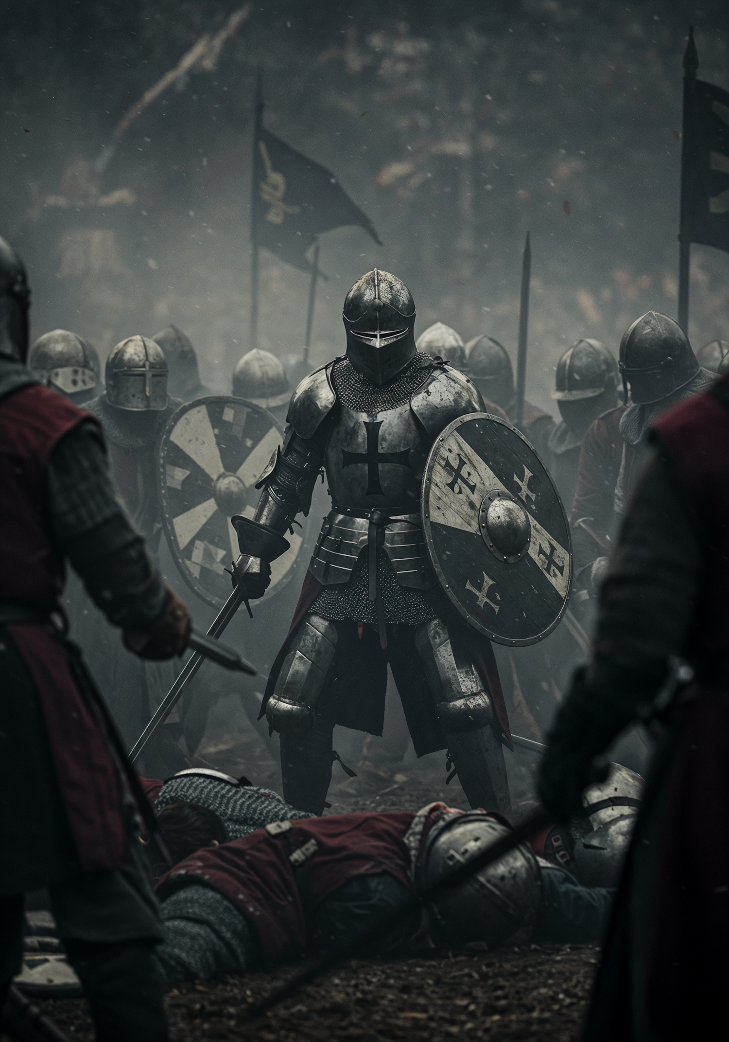 Epic medieval battle scene with knights in full armor, shields, and swords, set in a misty, intense battlefield with fallen soldiers.