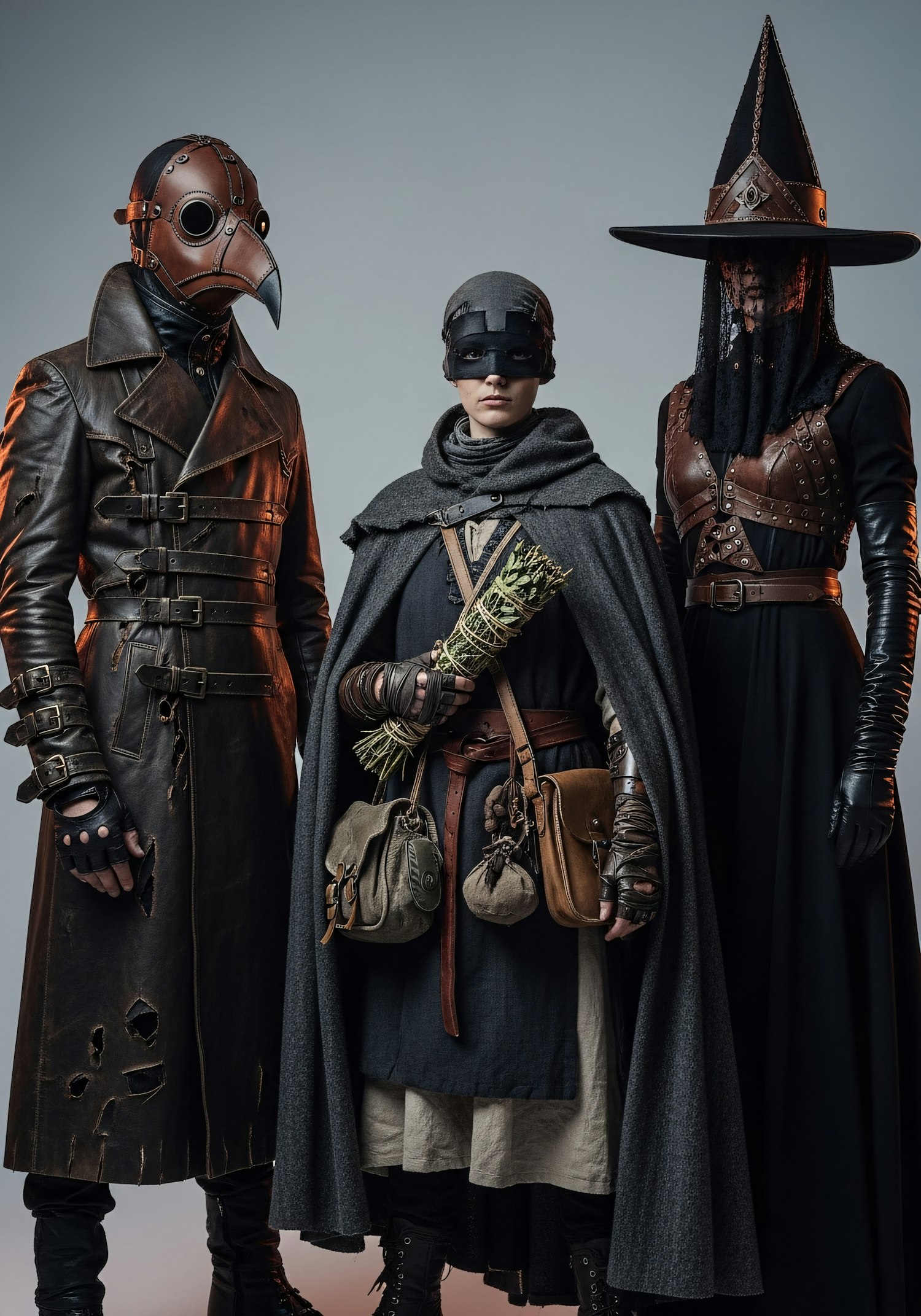 Three individuals in detailed medieval-inspired costumes, including a plague doctor, a herbalist, and a veiled figure with a pointed hat.