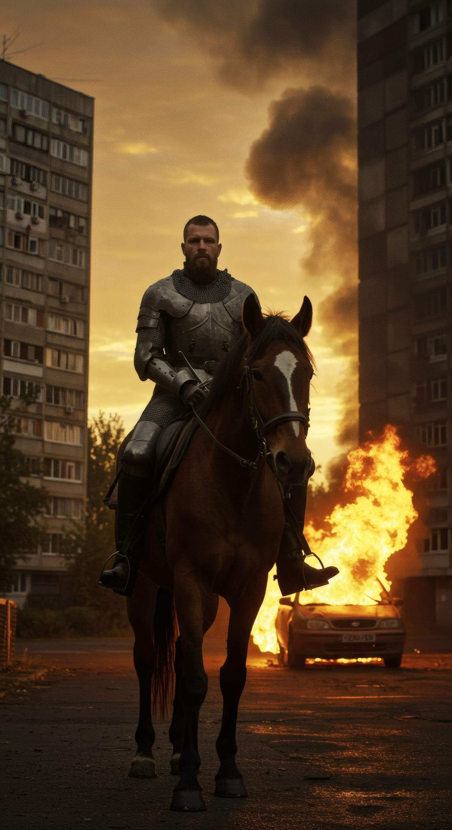 A knight in silver armor on horseback in an urban setting with a burning car and dramatic orange sky in the background.