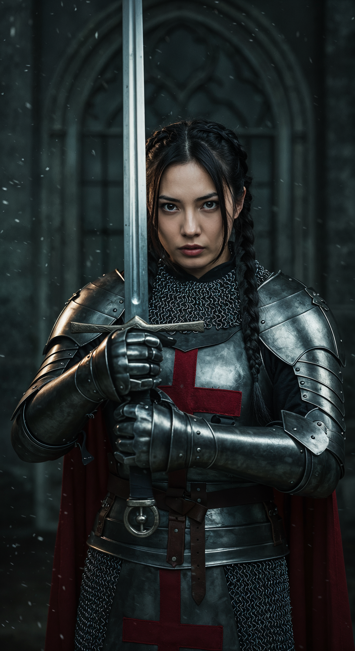 A fierce female knight in detailed armor with a red cross emblem holds a sword in a dramatic medieval setting with falling snow.
