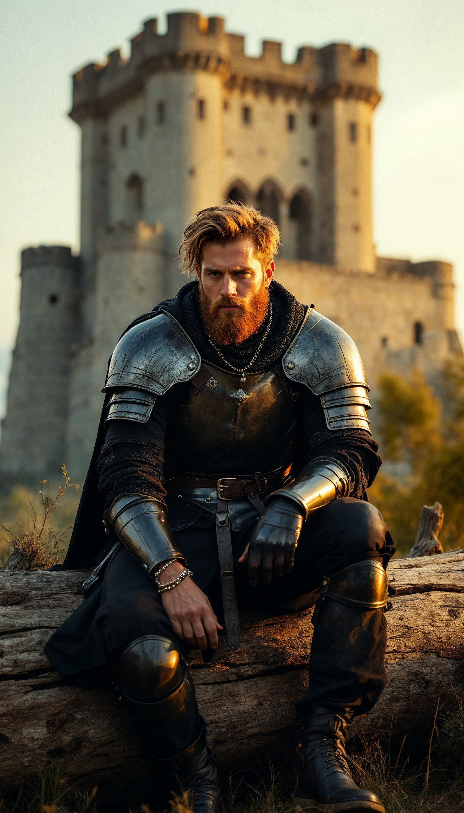 A bearded man in medieval armor sits in front of a castle, exuding a sense of historical drama and adventure.