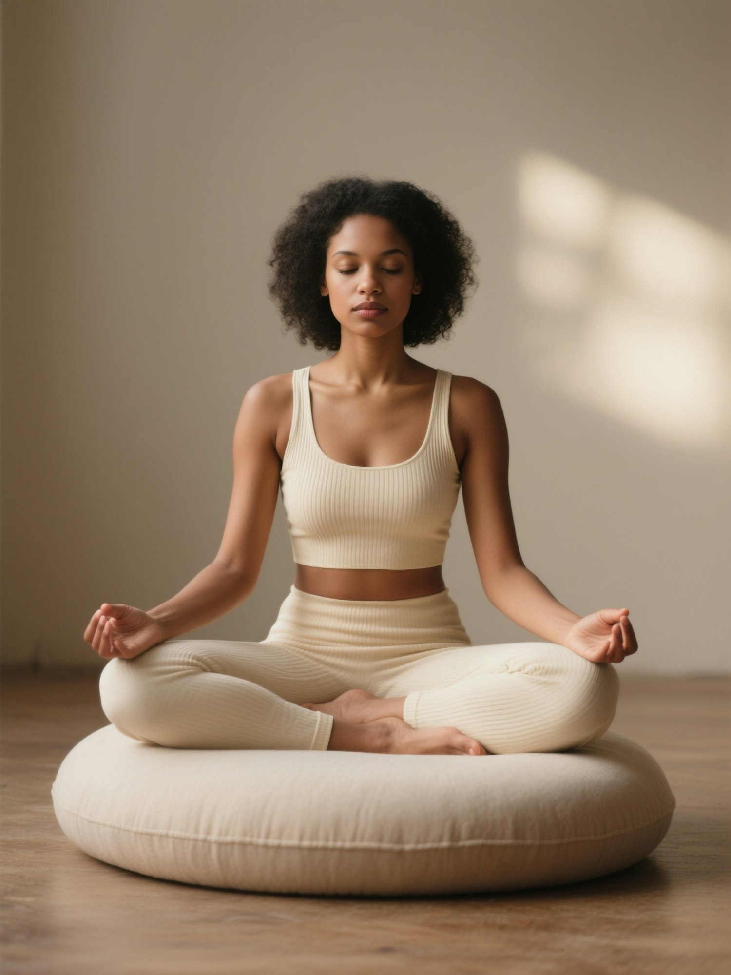 Minimalist, aesthetic editorial photography, soft neutral tones such as cream, beige, taupe, and warm browns, clean background, gentle light, high resolution — woman with dark skin tone seated cross-legged on a round meditation cushion, wearing a cream ribbed yoga set, hands resting on knees in mudra position