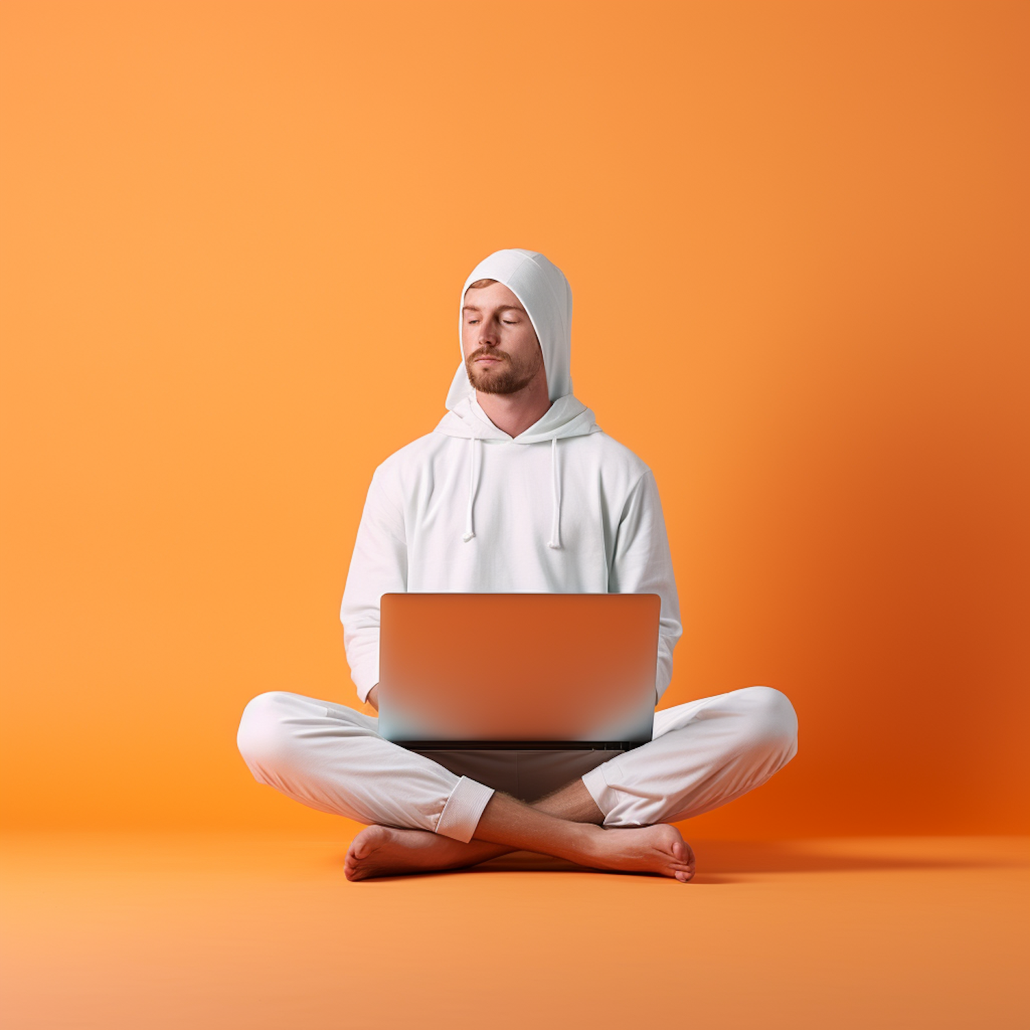 Man in white hoodie meditating with laptop on orange background, creating a serene and focused atmosphere.