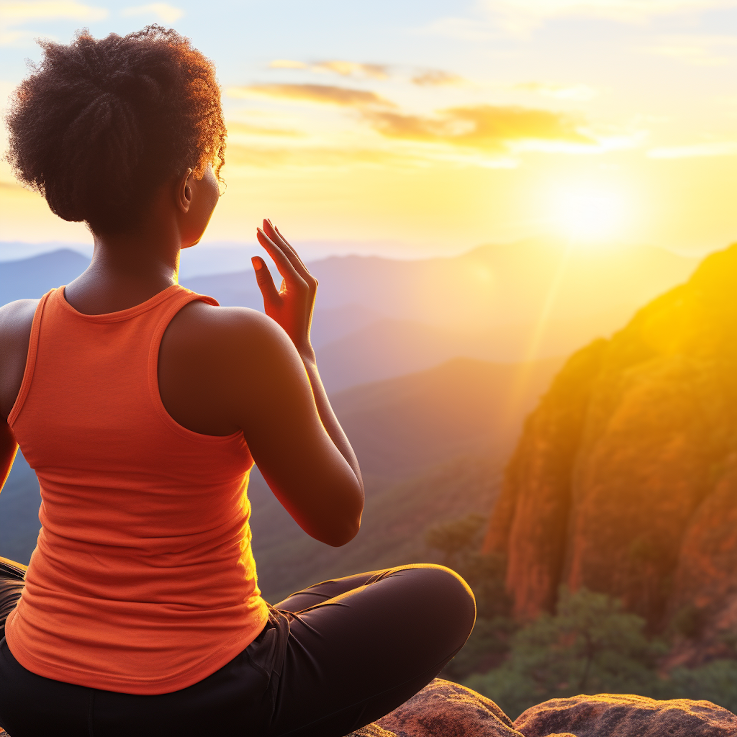 Woman meditating at sunrise on a mountain, wearing an orange tank top. Serene scene with warm sunlight and distant mountains.
