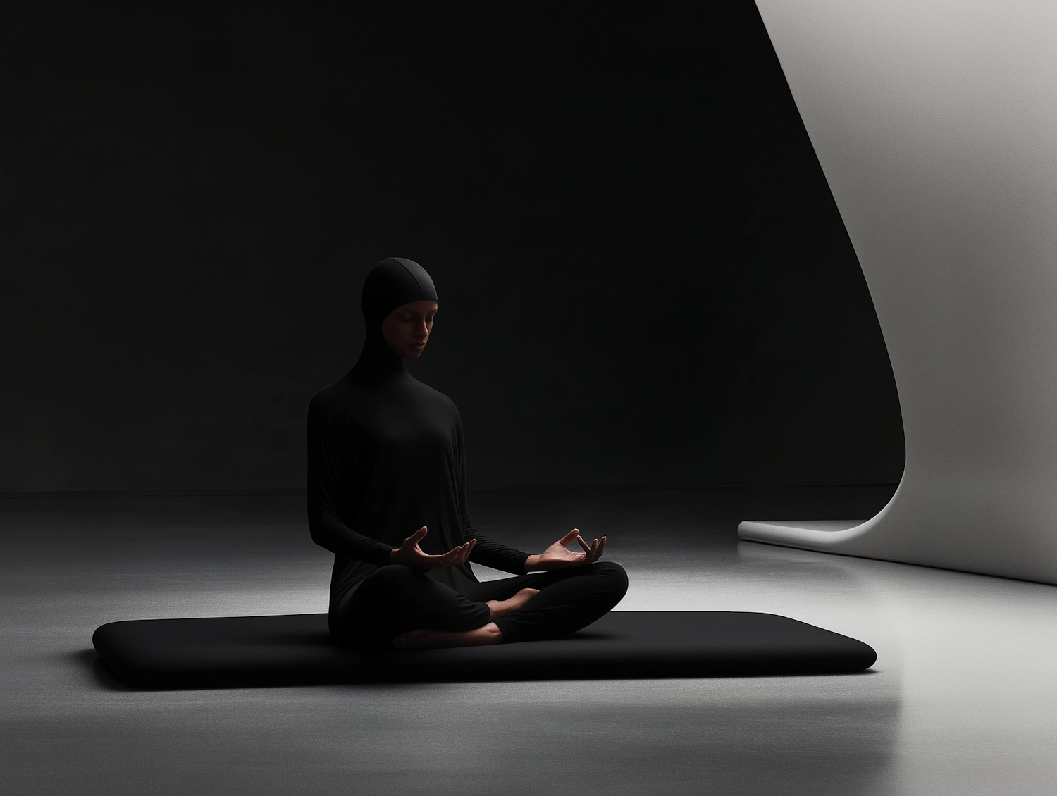 A person meditates in a dimly lit, minimalist space, sitting cross-legged on a black mat with a modern white structure in the background.