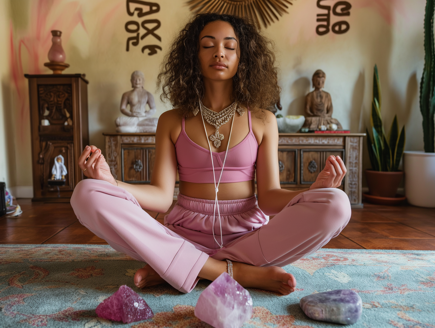Woman meditating in a serene room with crystals, wearing pink activewear, surrounded by Buddha statues and plants.