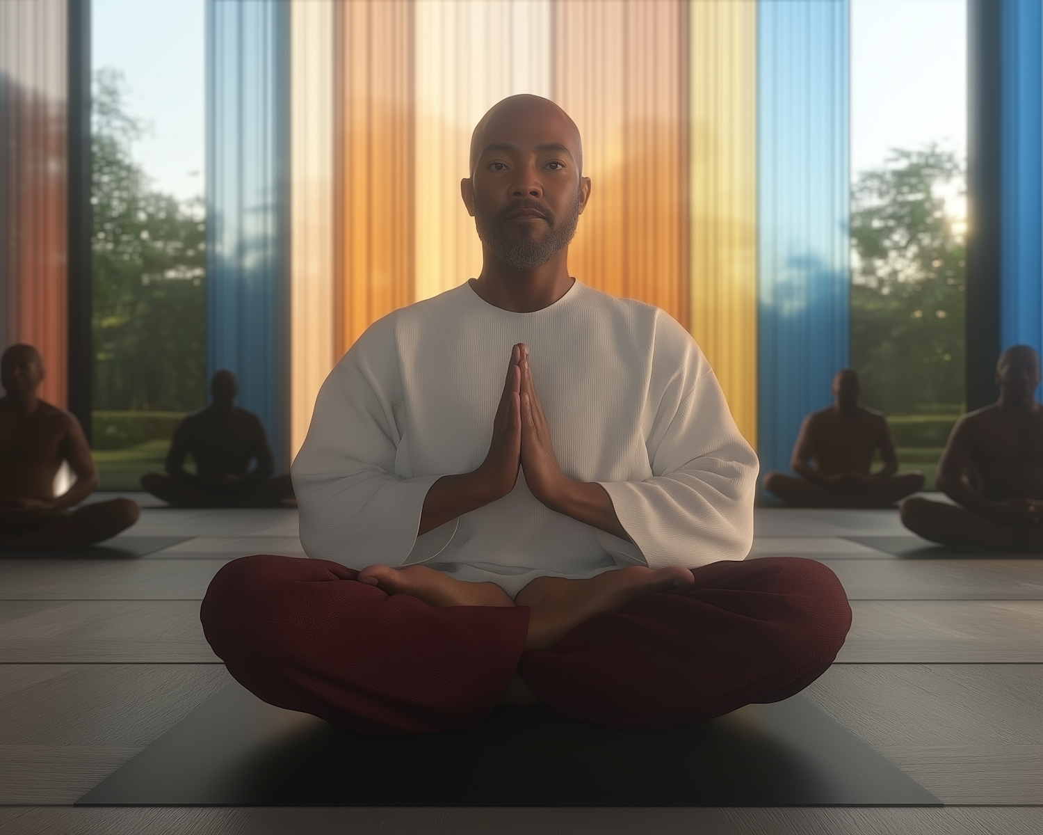 A serene meditation session with a diverse group, led by a calm man in a peaceful, light-filled room with colorful panels.