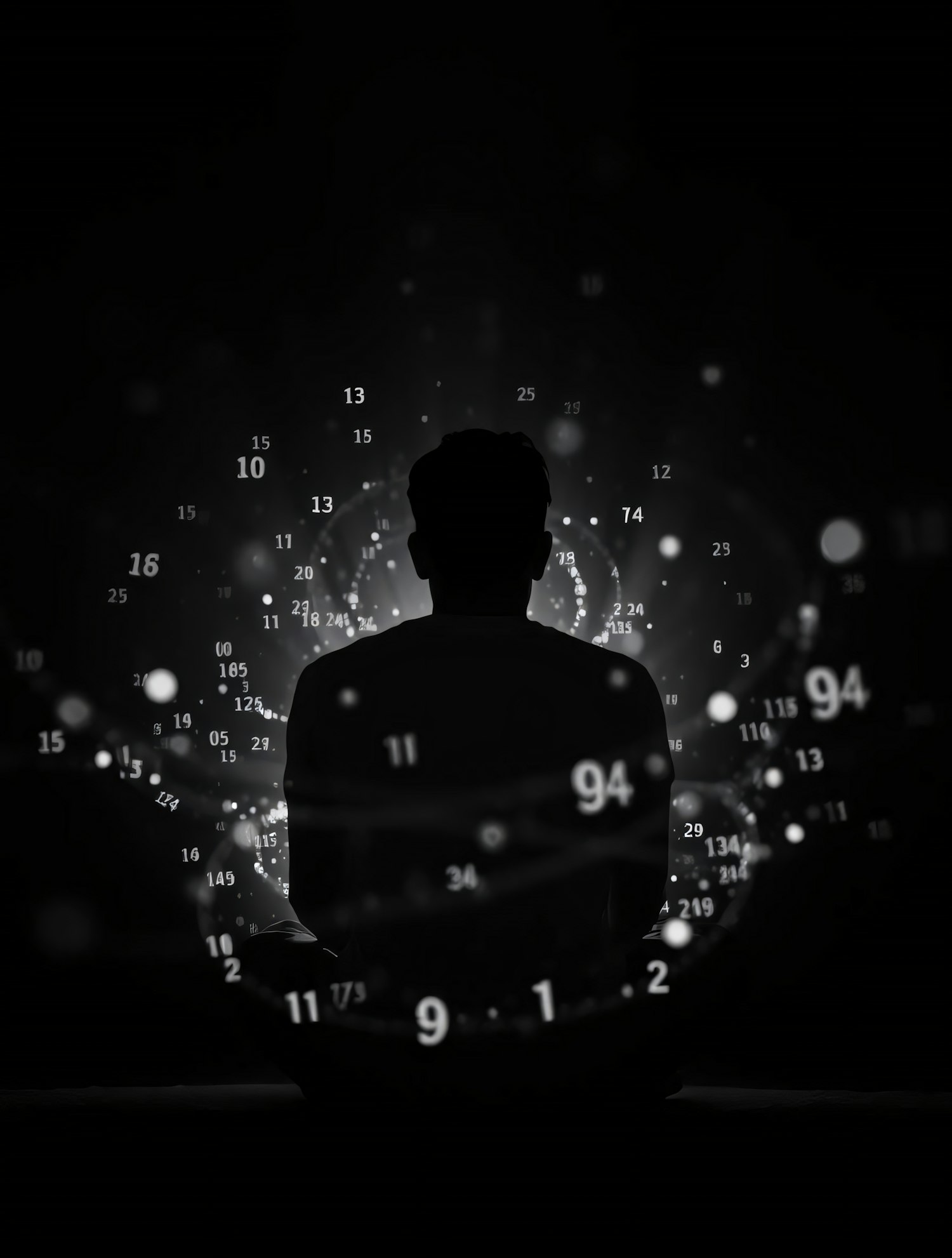 A silhouette meditates amidst glowing numbers and abstract light patterns, creating a serene and introspective atmosphere.