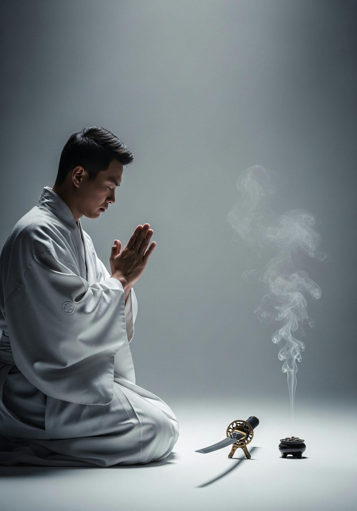 A man in traditional white attire meditates with a sword and incense burner, creating a serene and focused atmosphere.