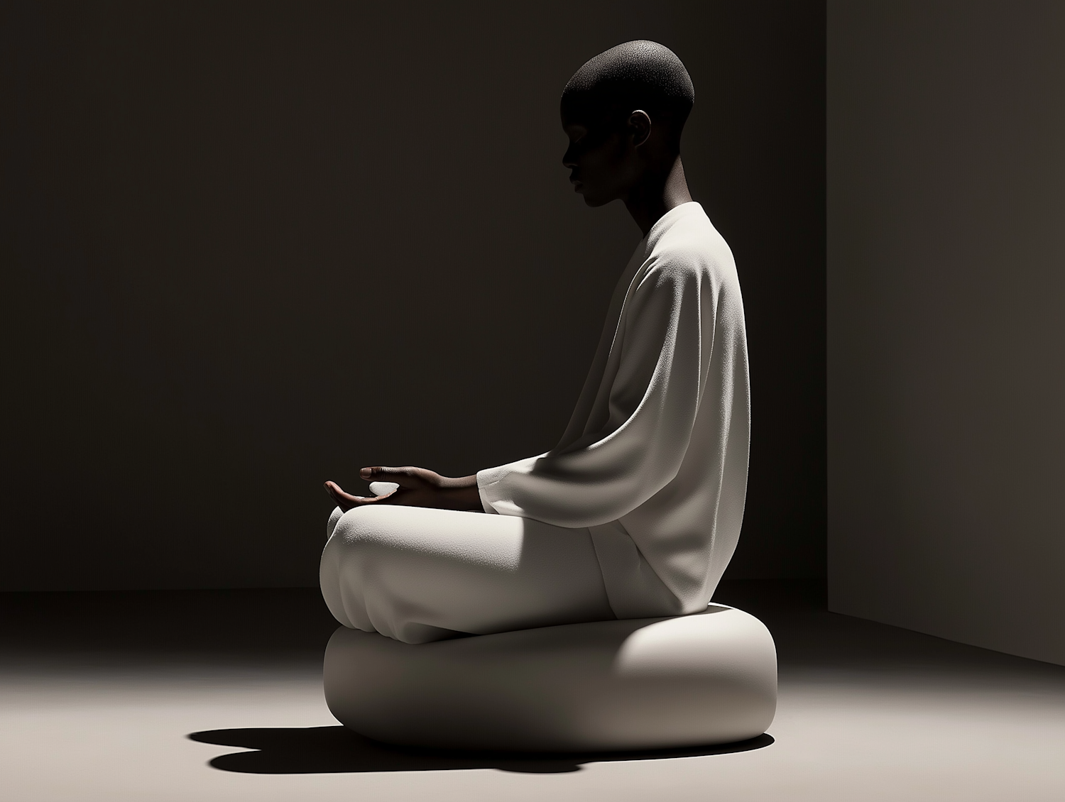 A person meditates in a dimly lit room, seated on a cushion in a white outfit. The serene lighting highlights their calm pose and minimalist setting.