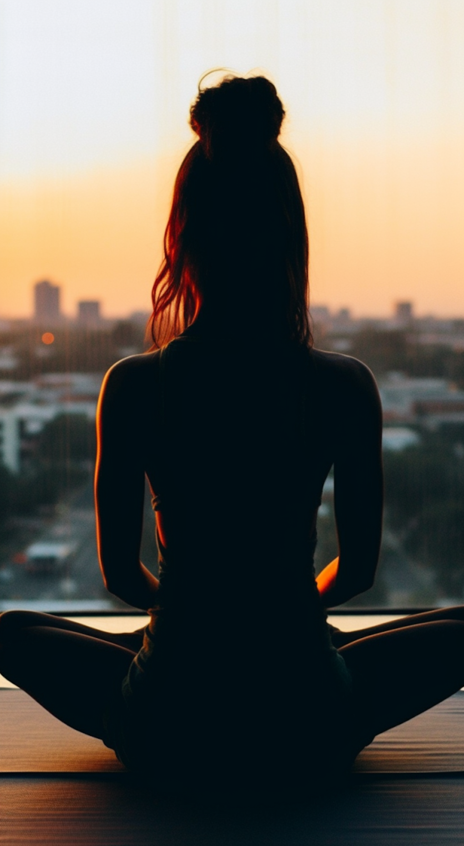 Silhouette of a person meditating by a window at sunset, overlooking a cityscape. Warm colors create a serene and introspective atmosphere.