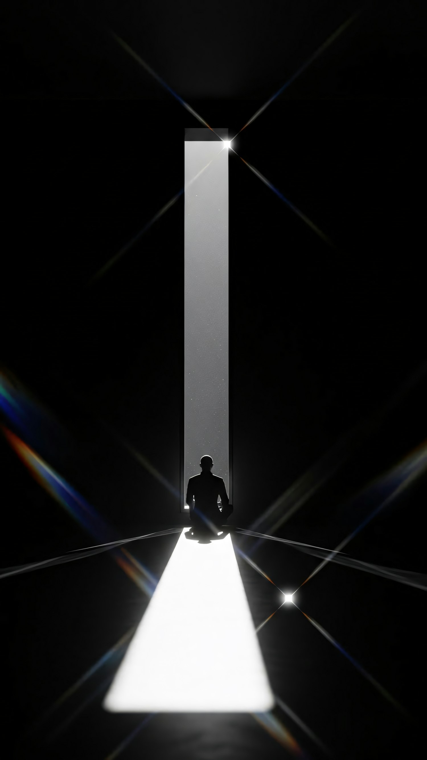 A silhouette meditates in a beam of light from a tall opening, surrounded by darkness, creating a serene and dramatic atmosphere.