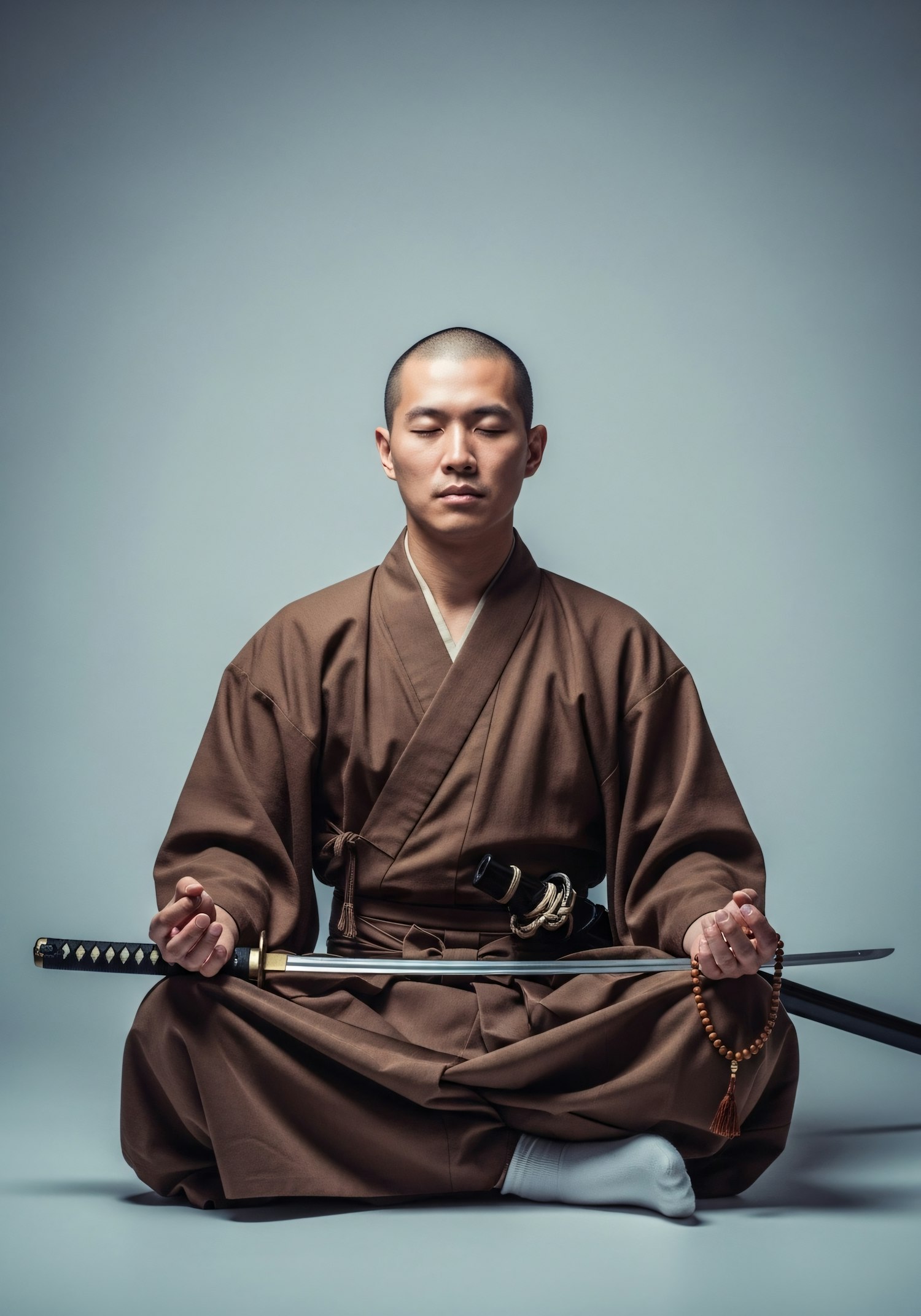 A serene individual in traditional attire meditates with a katana and prayer beads, embodying focus and cultural depth.