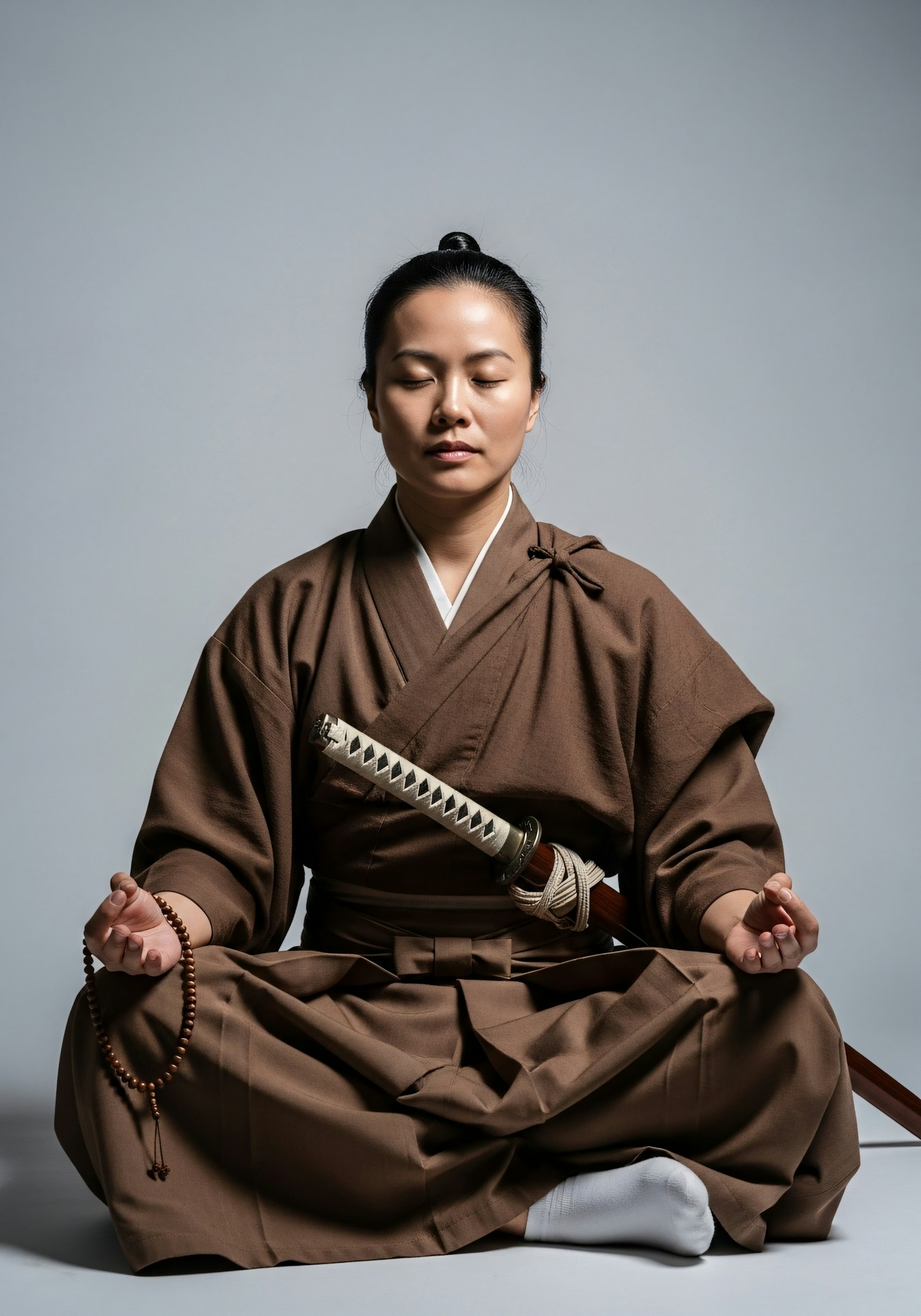 A serene individual in traditional attire meditates with a katana and prayer beads, embodying focus and tranquility.