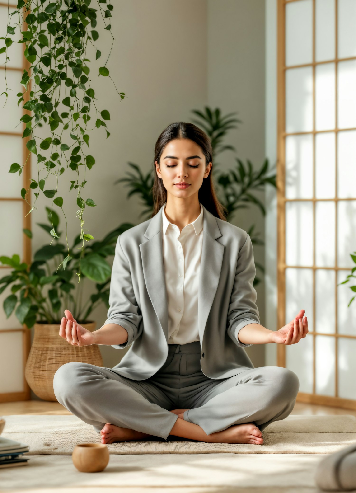 Asian woman in a gray suit meditating in a serene room with plants and natural light, embodying calm and focus.