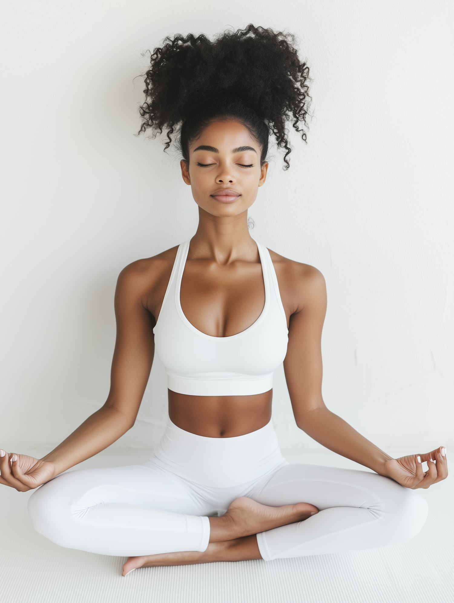 A woman in white activewear meditates with closed eyes, exuding calm and focus. Her curly afro adds a dynamic touch to the serene scene.