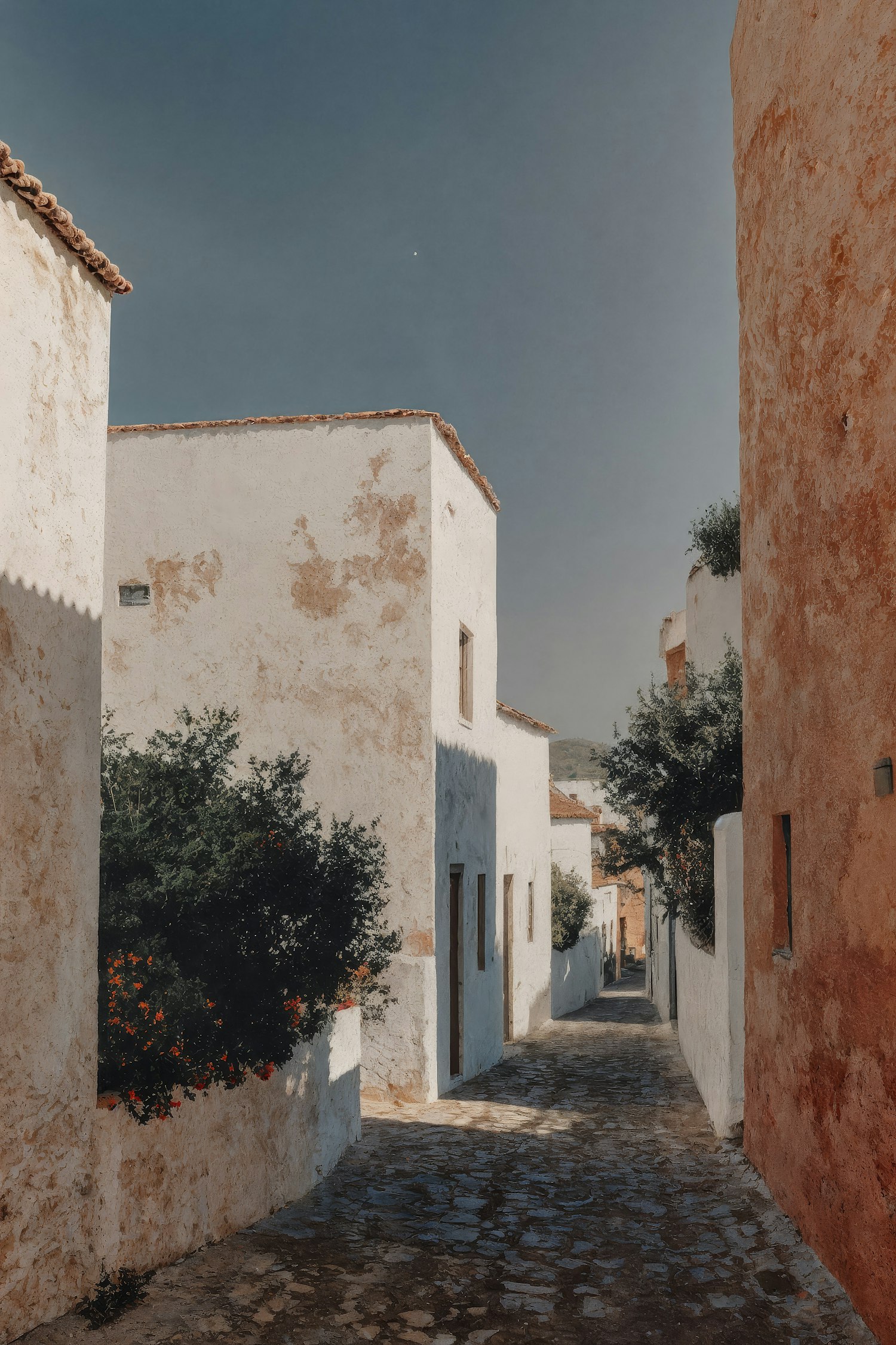 Charming Mediterranean alley with whitewashed walls, cobblestone path, and vibrant greenery under a clear blue sky.