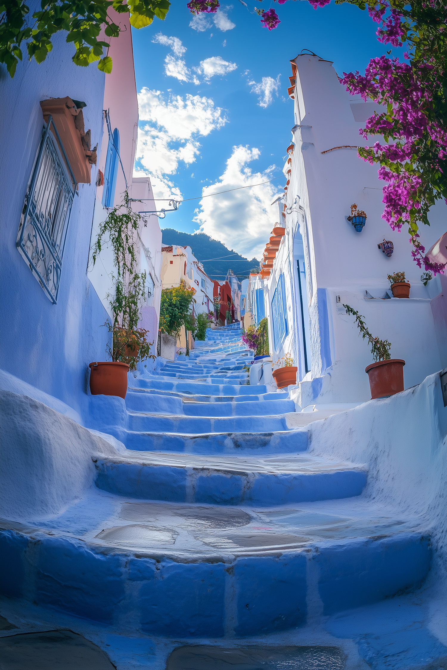 Charming alleyway with blue steps, whitewashed buildings, and vibrant bougainvillea under a bright blue sky.