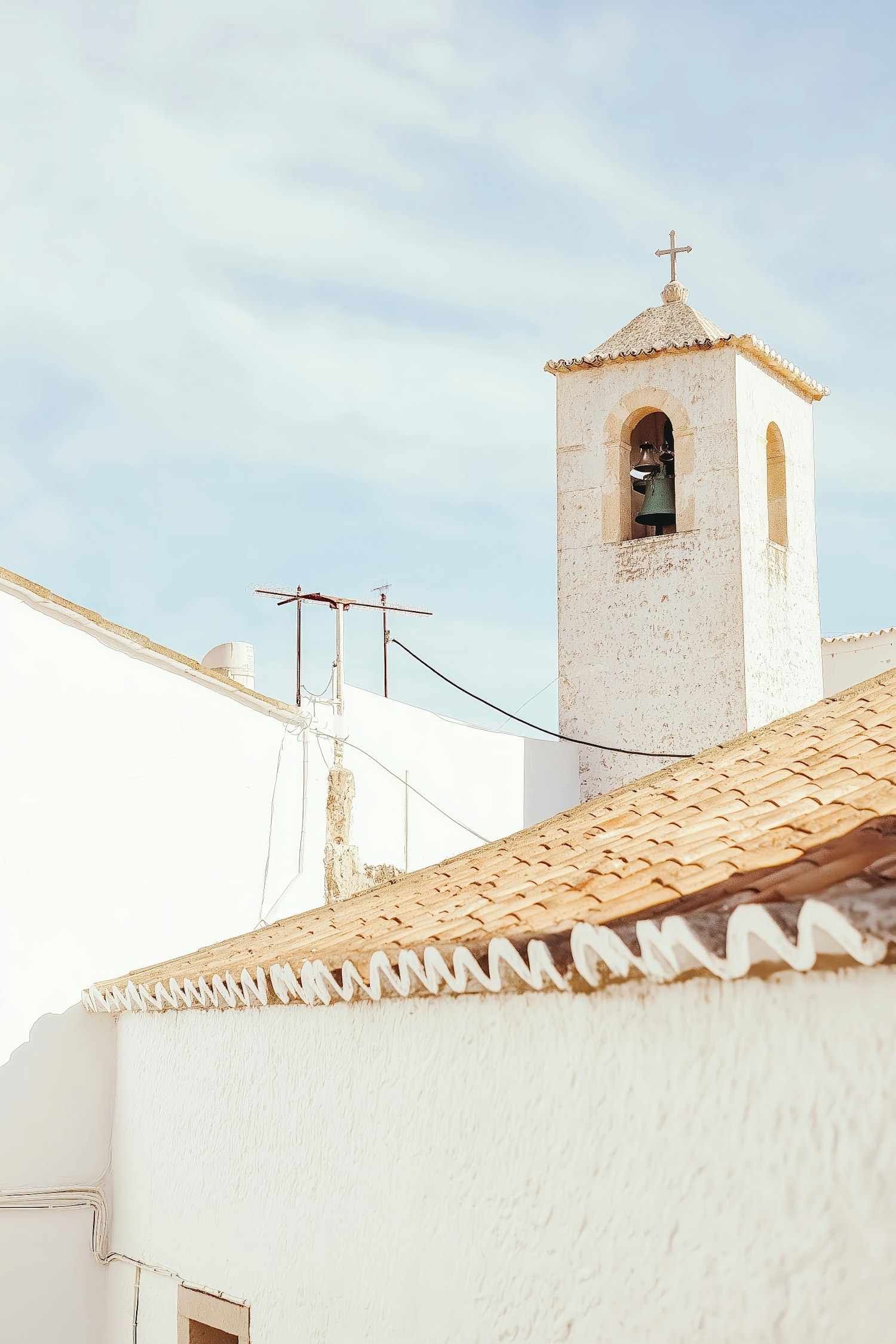 Charming Mediterranean-style bell tower with whitewashed walls, terracotta roof, and a serene blue sky in the background.