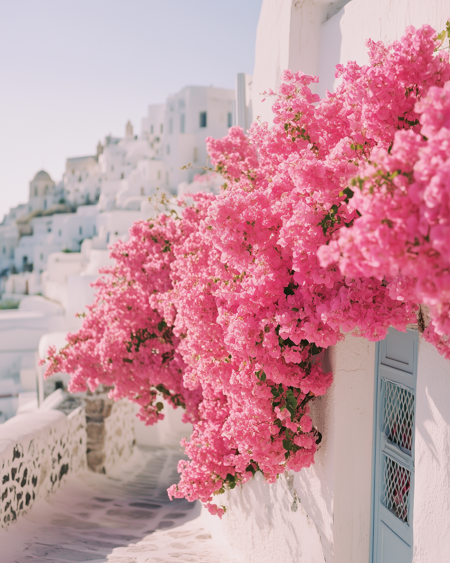 Vibrant pink bougainvillea against whitewashed Mediterranean architecture, creating a serene and picturesque scene.