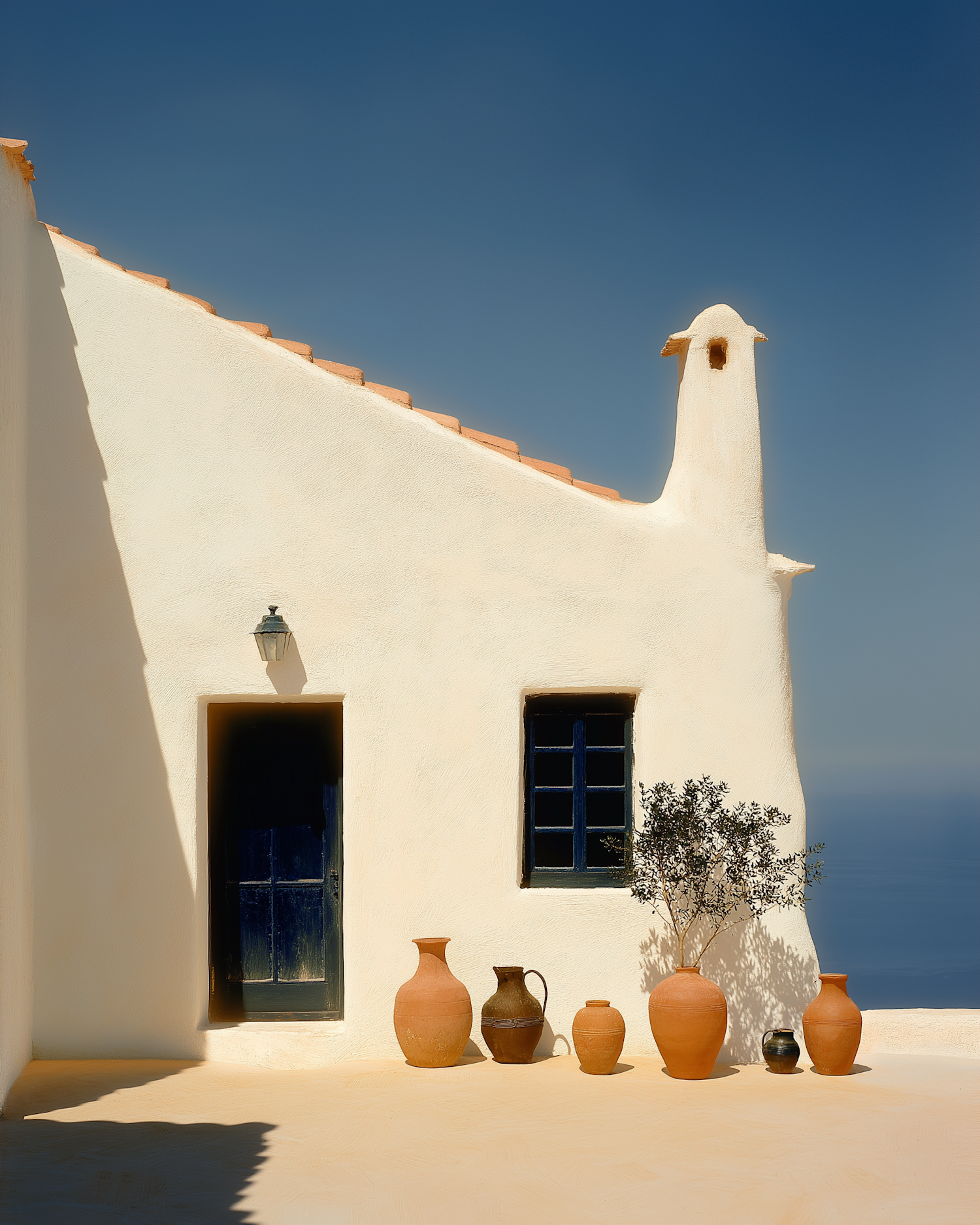 Mediterranean-style whitewashed building with terracotta pots, blue door, and sea view under a clear blue sky.