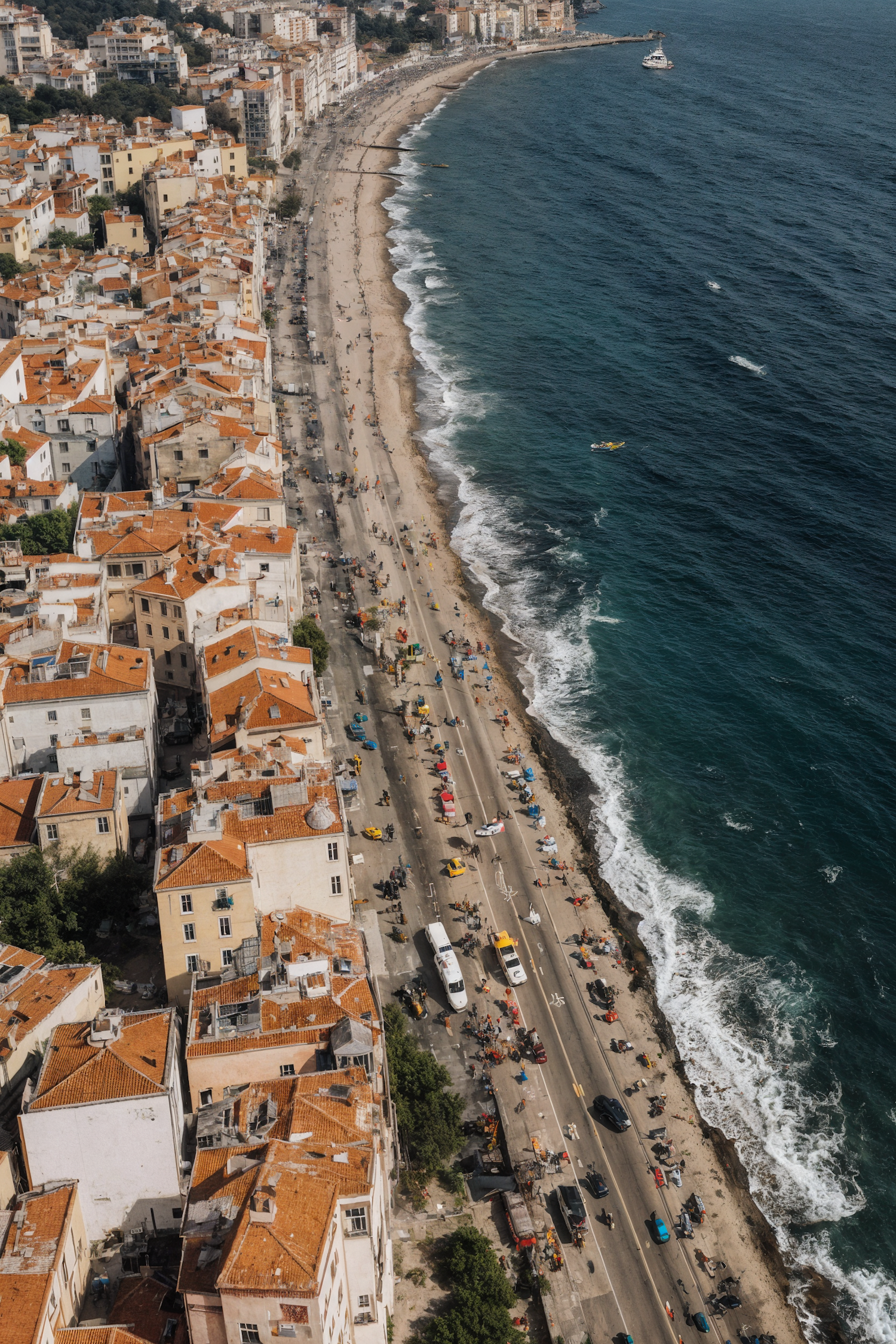 Aerial view of a coastal city with red-roofed buildings, a bustling road, and a lively beach along a deep blue ocean.