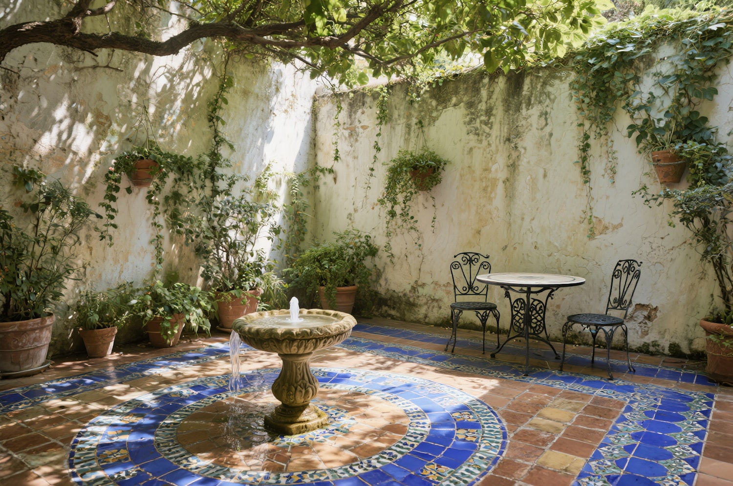 Charming courtyard with a fountain, vibrant tiles, and lush greenery. Perfect for a tranquil escape or a cozy outdoor gathering.