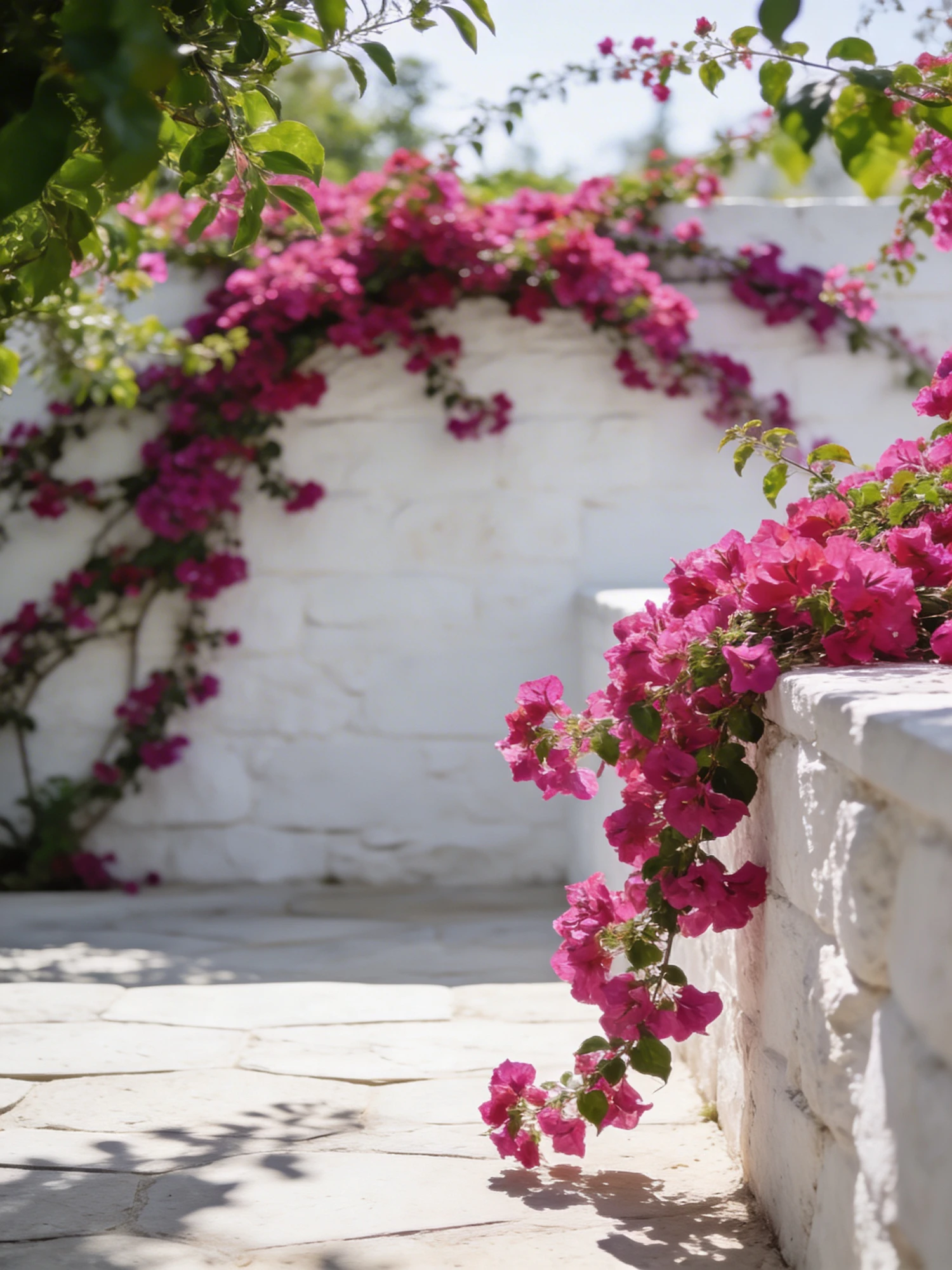A quiet courtyard with white stone walls and magenta bougainvillea climbing across the surface, soft shadows, minimal styling, no text.